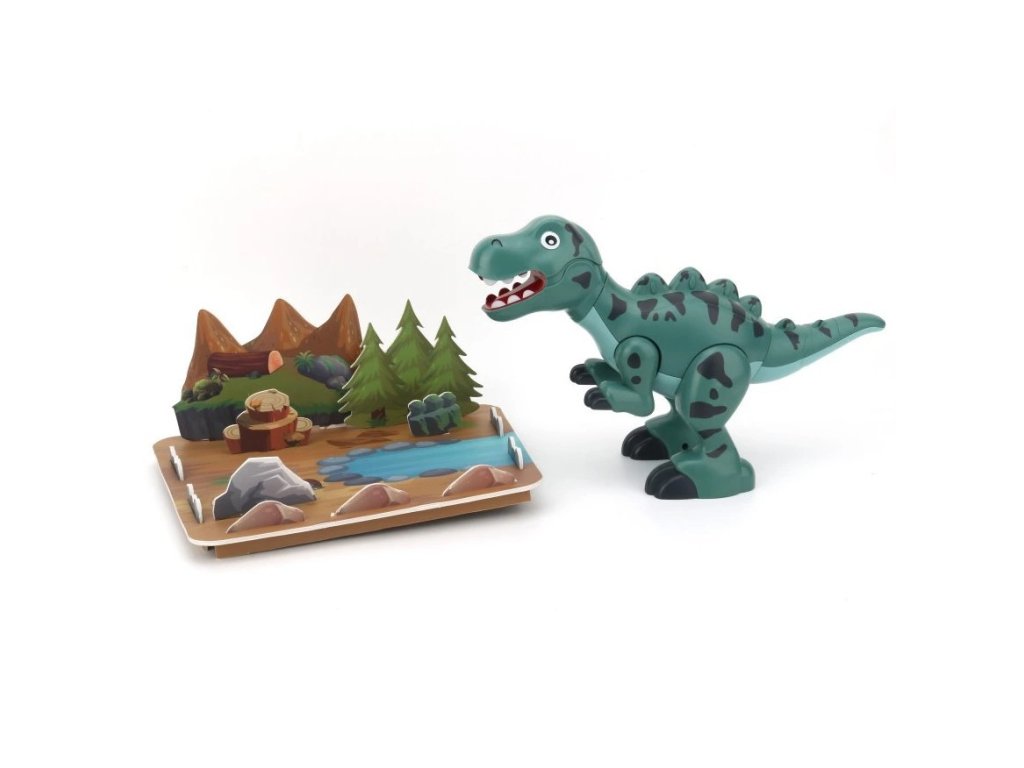 Součástí balení je i tematická podložka s přírodním motivem, která zobrazuje scenérii s jezírkem, stromy, skalami a dřevěnými pařezy, což vytváří vhodné prostředí pro hraní a rozvíjení dětské představivosti. Podložka je vyrobena z pevného kartonu a díky svému designu zároveň slouží jako dekorativní prvek. Celý set obsahuje celkem sedm kusů, které dohromady tvoří kompletní model a podkladovou scénu.