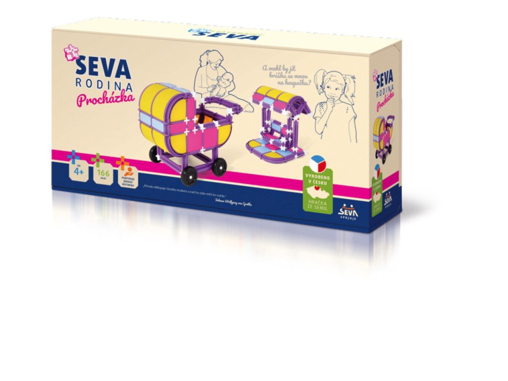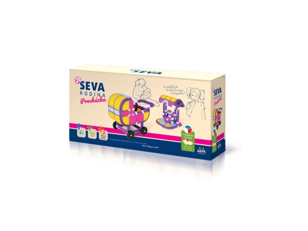 Stavebnice SEVA RODINA - Procházka obsahuje 166 dílků. Postavte si kočárek, houpačku i mnoho jiného. Vyhovuje evropské normě EN71 o bezpečnosti hraček a její kvalita je pravidelně kontrolována. Všechny stavebnice SEVA jsou navzájem kompatibilní a jejich možnosti se dají stále rozšiřovat. Stavebnice je kreativní, dětem rozvíjí mysl i manuální zručnost a podporuje jemnou motoriku.