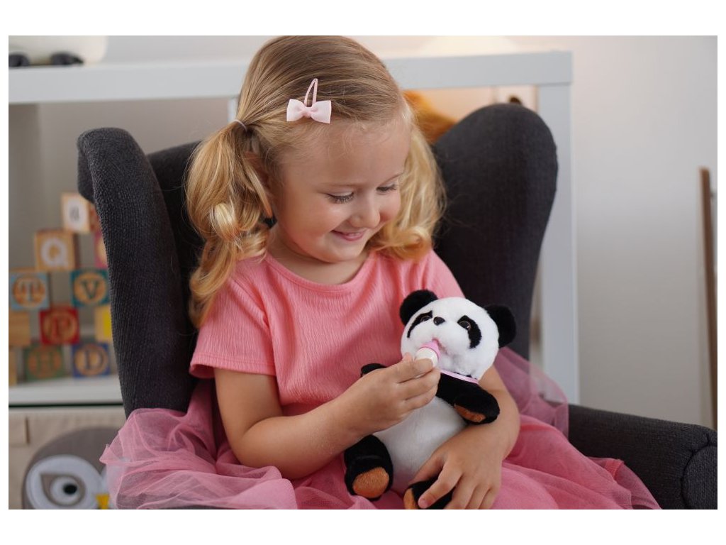 Přiložte láhev s mlékem k tlamě, ozve se zvuk pití. Vyjměte láhev s mlékem, ozve se roztomilý zvuk.