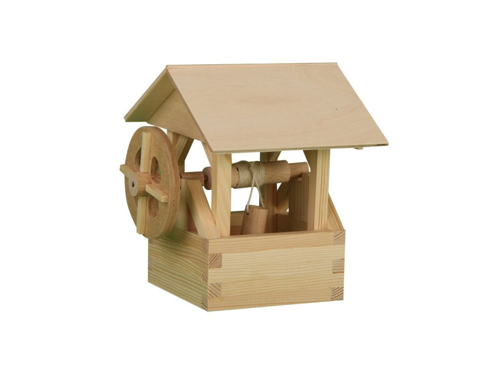 Propracovaná dřevěná studna s vědrem a stříškou je skvělým doplňkem k ostatním dřevěným slepovacím stavebnicím z naší série CREATIVE KIT.