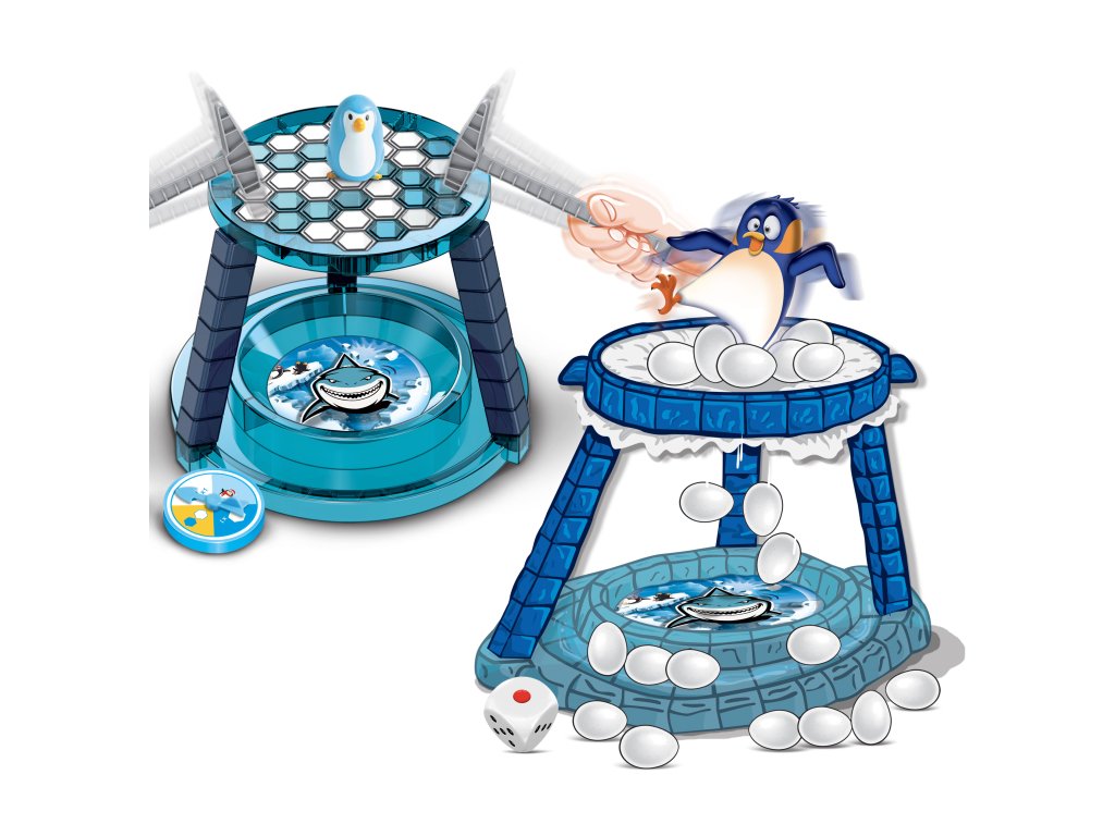 Dvě zábavné hry v jednom balení! Užijte si dvojnásobnou porci zábavy s touto jedinečnou hrou 2v1! Testujte svou zručnost, trpělivost a strategii ve dvou napínavých hrách s roztomilým tučňákem. Která hra se stane vaším favoritem? Obsah balení: 1× základna iglú 3× nohy pro sestavení 2× obruče 1× otočný ukazatel 2× obří pinzety Balíček kapesníků 38× ledových kostek 2× paličky 1× tučňák 40× tučňáčích vajíček 1× kostka Podrobný návod ke hře HRA 1: VÝZVA TENKÉHO LEDU! Jak hrát: 1. Sestavte iglú - Vložte nohy do základny a připevněte první obruč 2. Připravte led - Nalijte trochu vody do kanálku a položte vajíčka dovnitř 3. Vytvořte tenký led - Natáhněte kapesník přes vrchol a upevněte druhou obručí 4. Postavte tučňáka - Umístěte tučňáka na vrchol "ledu" 5. Začněte výzvu - Hoďte kostkou, vezměte pinzetu a umístěte určený počet vajíček na led 6. Pozor na prasknutí! - Led se stává tenčím s každým přidaným vajíčkem Vítězství: