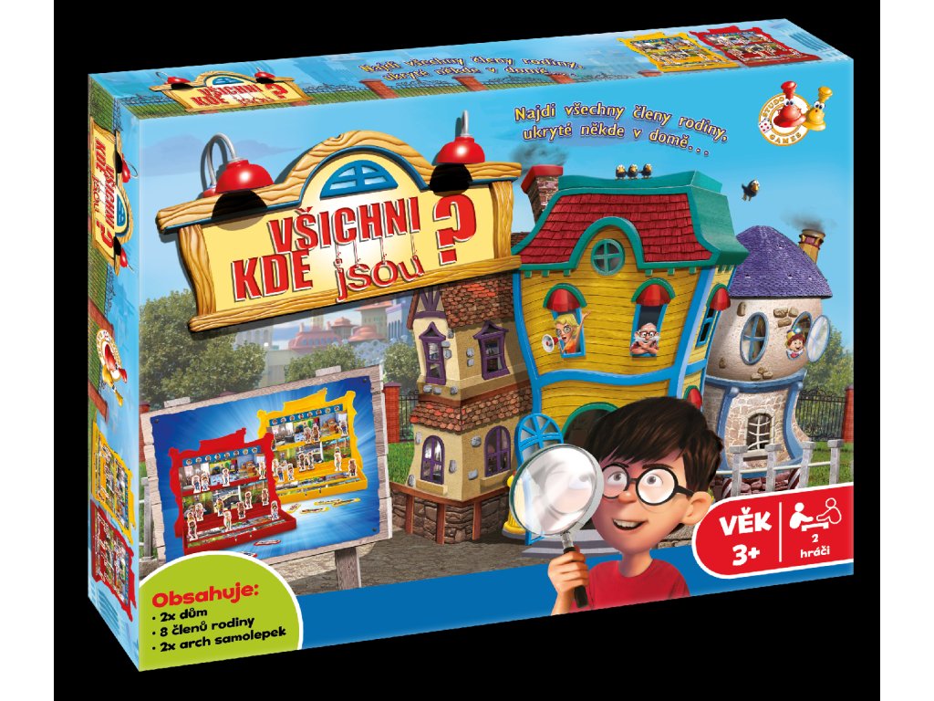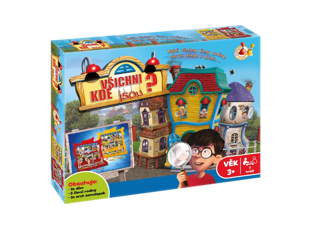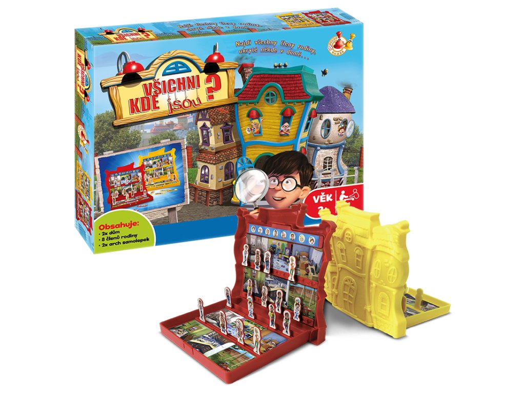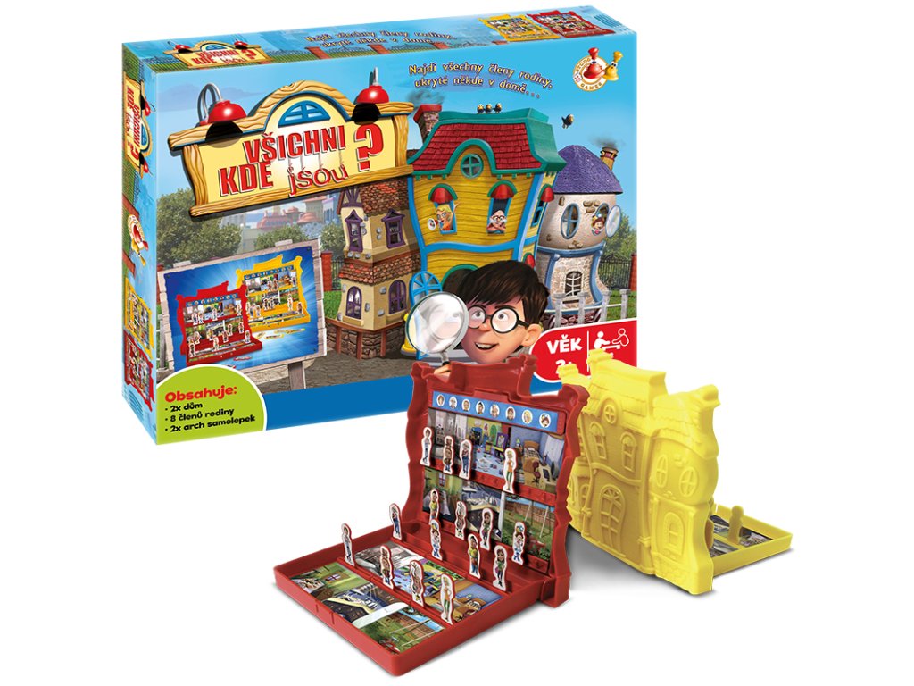 Najdi všechny členy rodiny, ukryté někde v domě. Balení obsahuje 2× dům,8 členů rodiny, 2× arch samolepek. Hra určena pro 2 hráče od 3 let