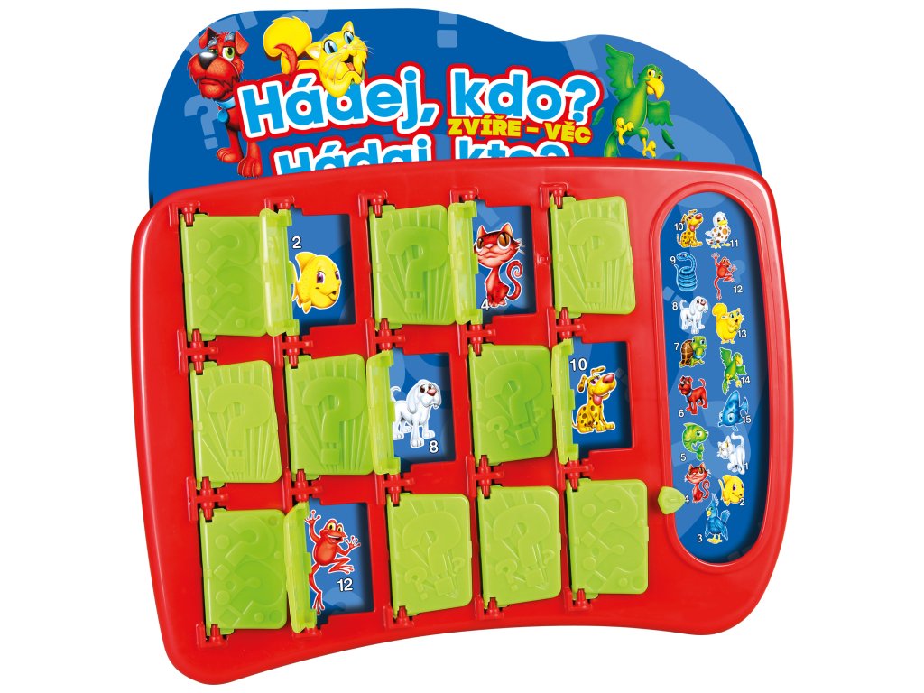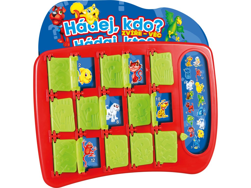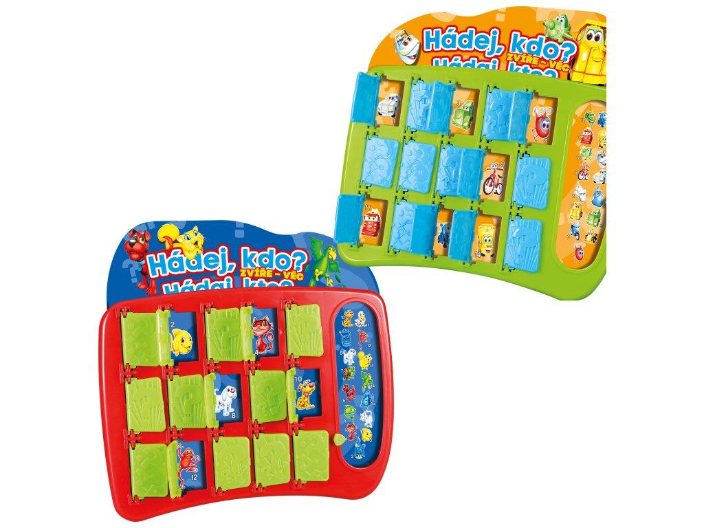 Zábavná hra pro celou rodinu plná hádanek a překvapení! Oblíbená hra Hádej, kdo? v tematické verzi se zvířaty a věcmi přináší zábavu pro malé i velké! Položte chytré otázky, eliminujte možnosti a odhalte tajemnou postavu vašeho soupeře dříve, než on odhalí tu vaši. Jak hrát: 1. Vyberte si kartu s postavami a zasuňte ji do herního pole 2. Nastavte svou tajnou postavu, kterou bude soupeř hádat 3. Střídejte se v pokládání otázek typu ANO/NE 4. Zavírejte dvířka u postav, které podle odpovědí nemohou být hledanou postavou 5. Uhodněte tajemnou postavu soupeře dříve než on tu vaši! Příklady otázek: Pro zvířata: Štěká tvoje zvíře? Má tvoje zvíře skvrny? Je tvoje zvíře modré? Má tvoje stvoření drápy? Má tvoje stvoření ploutve? Pro věci: Je tvoje jídlo kyselé? Obsahuje tvoje jídlo sýr? Zahrnuje tvoje jídlo čokoládu? Má tvoje vozidlo jen dvě kola? Umí tvoje vozidlo létat?