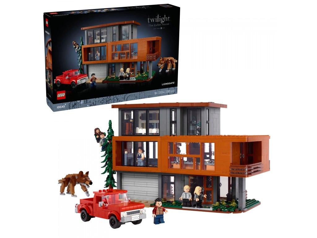 Fantastické příběhy o upíří romantice ze ságy Stmívání ožívají s touto sběratelskou stavebnicí LEGO® Ideas pro dospělé (21354). Tato sběratelská stavebnice obsahuje výstavní model domu Cullenových a představuje skvělý fantasy dárek pro ženy, muže a milovníky romantické filmové ságy Stmívání.Střechu a jednotlivá patra domu můžete odejmout a prohlédnout si propracovaný interiér. Stavebnice obsahuje 7 minifigurek – Bellu Swanovou, Edwarda Cullena (s třpytivým efektem), Jacoba Blacka, Carlislea Cullena, Alici Cullenovou, Charlieho Swana a Rosalii Haleovou – a pohyblivou figurku Jacoba ve vlčí podobě. Model Bellina auta z kostek a vysoký strom, na který může Edward s Bellou vylézt, doplní tento výstavní kousek, který každé místnosti dodá stylovou upírskou náladu.