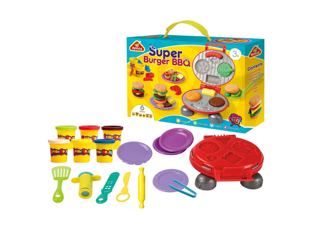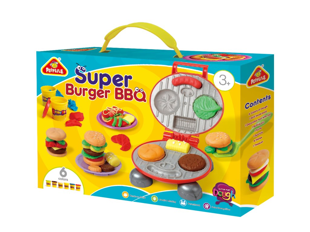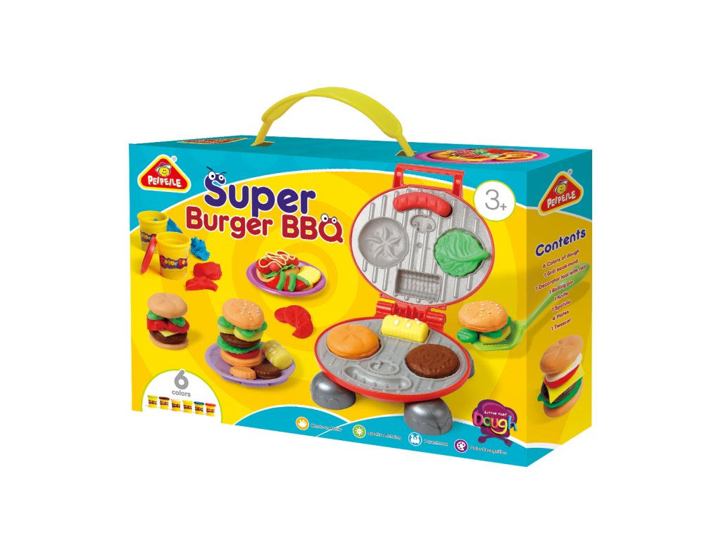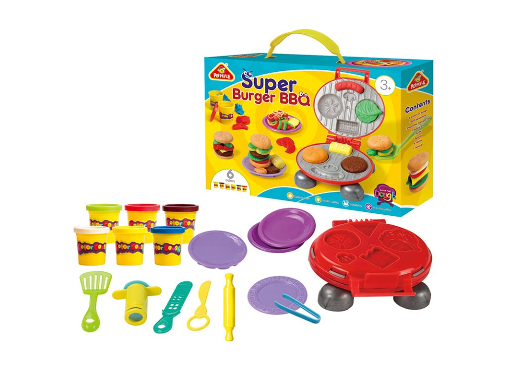 Sada pro výrobu burgerů. Hmota je bezpečná, netoxická, měkká a pružná. Hmota nevysychá, pokud je uchovávaná v dobře uzavřeném kelímku a je možné jí používat znovu a znovu. Sada obsahuje 6 kelímků s modelínou, strojek/gril na vaření burgerů, příslušenství.