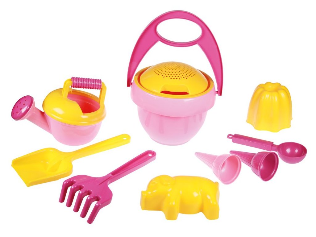 Set na písek obsahuje kyblík o průměru 17 cm, sítko, hrabičky, lopatku, dvě bábovičky, dva zmrzlinové kornoutky, konvičku a zmrzlinovou naběračku. Celkem 10 dílů. Pro dívky od 2 let.