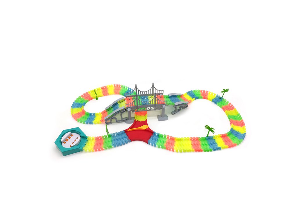 autíčkem a příslušenstvím. Dráha je flexibilní a dá se z ní postavit jakýkoliv tvar. Buď kreativní a postav si dráhu podle sebe. Dráha ve tmě fosforeskuje.