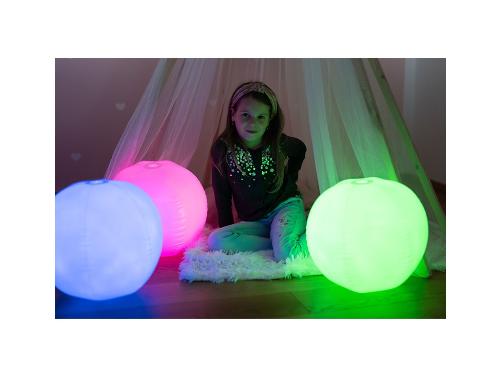 40 cm nafukovací míč s LED diodou. Součástí ovladač, kterým se přepíná barva svícení, četnost svícení, automatické vypnutí. Míč je voděodolný a pevný. Vhodný pro hry venku, uvnitř i v bazénu. POZOR! Před nafouknutím a prvním použitím vyndejte diodu z balónu, odšroubujte víčko a odstraňte pojistku mezi bateriemi, která slouží k zabránění rozsvícení balónu v krabici.