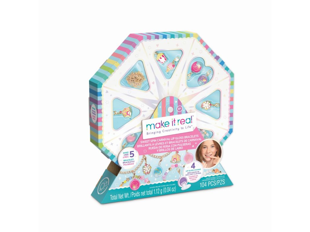 Zkuste své štěstí na veletrhu a vytvořte si pět DIY kouzelných náramků! Každý náramek obsahuje elegantní smaltovaná kouzla, která přinášejí nostalgickou radost ze dne stráveného na karnevalu. Sada obsahuje čtyři vlastní přívěsky s leskem na rty s jahodovou vůní, které ozdobí náramky a dodají šmrnc každému vzhledu make-upu. Obal s motivem ruského kola se dokonce otáčí, díky čemuž je tato sada zábavná jak pro hraní, tak pro tvoření. Tato sada je ideální pro děti, které chtějí svému dennímu outfitu dodat nádech stylu, a je fantastickým dárkem k narozeninám, svátku nebo jen tak. Veškerá kosmetika je testována na bezpečnost pro věk 8+.