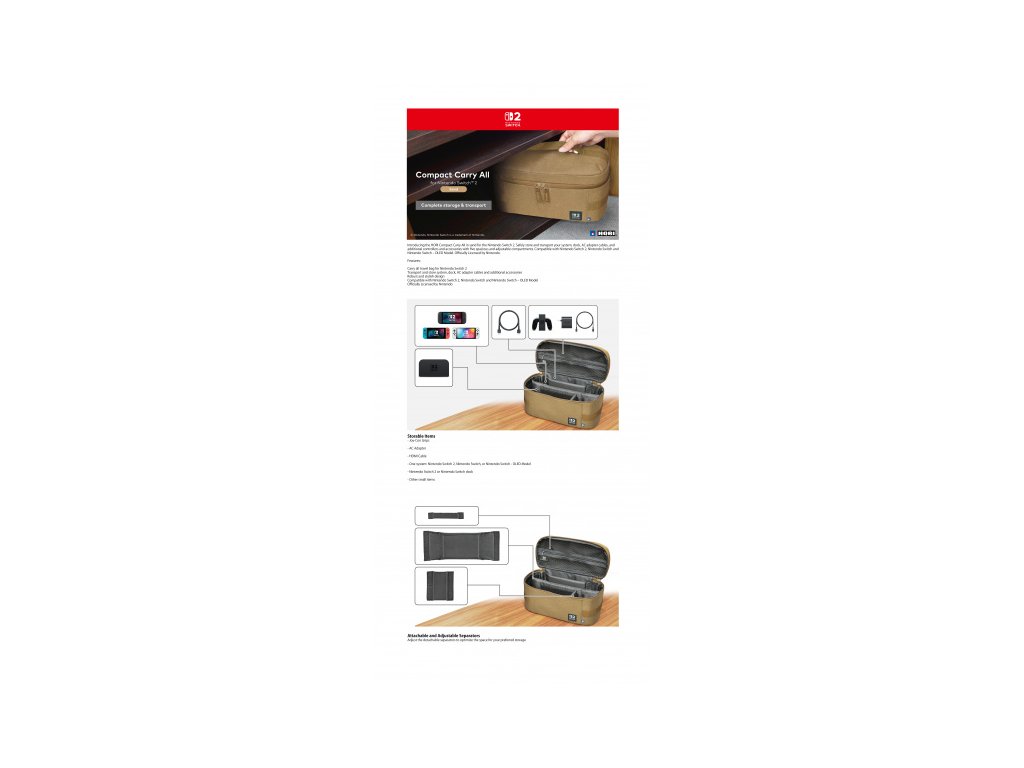 Cestování s herními nezbytnostmi je nyní mnohem pohodlnější s HORI Compact Carry All (Sand) pro Nintendo Switch™ 2. Bezpečně uložte a přenášejte svou konzoli, dock, kabely AC adaptéru a další ovladače či příslušenství díky pěti prostorným a nastavitelným přihrádkám. Oficiálně licencováno Nintendo®.
