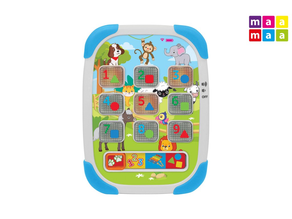 Tablet dětský - mluví česky. Rozměry 14,5x20 cm. Světelné a zvukové efekty. 3xAAA baterie součástí. Přepínač na pravém boku - vypnuto, nižší, vyšší hlasitost. 4 módy posunem oranžového čtverce a následné stisknutí čísel - 1. výuka zvířátek, 2. výuka čísel, 3. zvuky xylofónu a melodie, 4. výuka barev a tvarů.