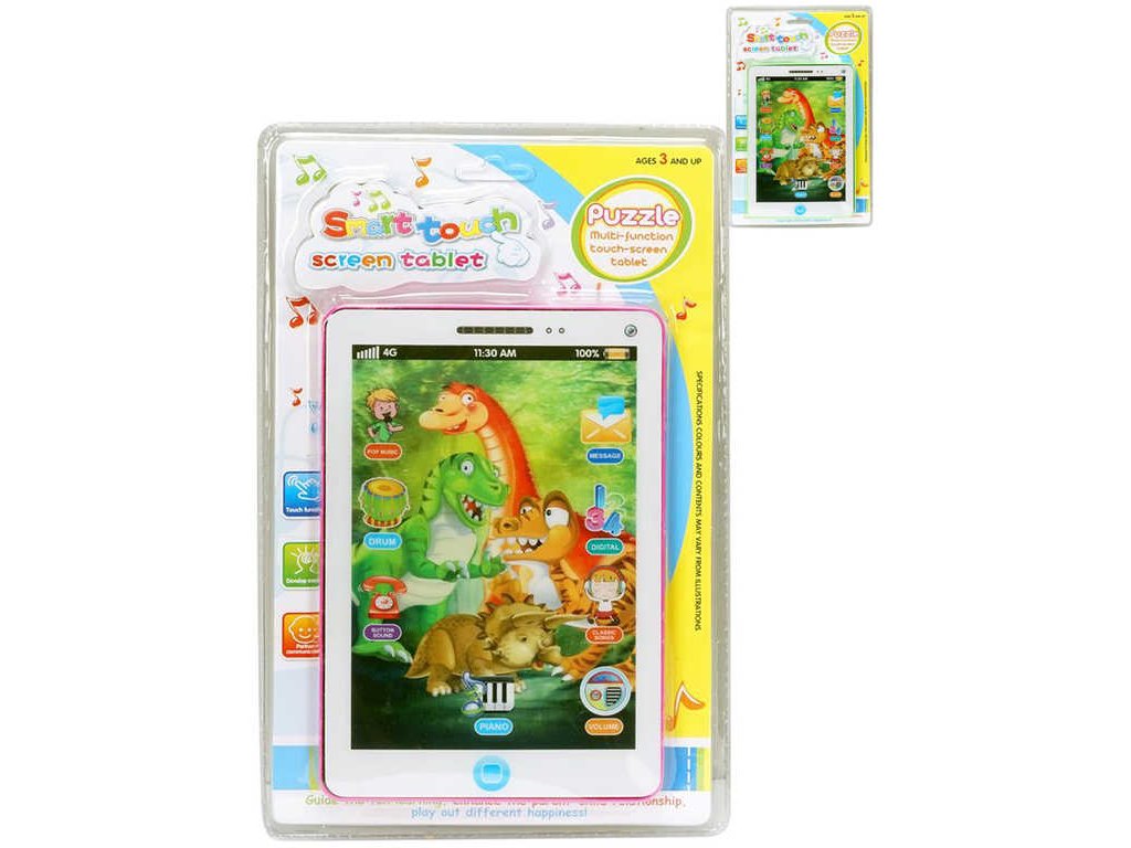Zábavný multifunkční dotykový tablet se zvuky a melodiemi. Hračka na baterie. Holografický motiv s dinosaury. Hračka ve dvou barevných variantách. Baleno na kartě.