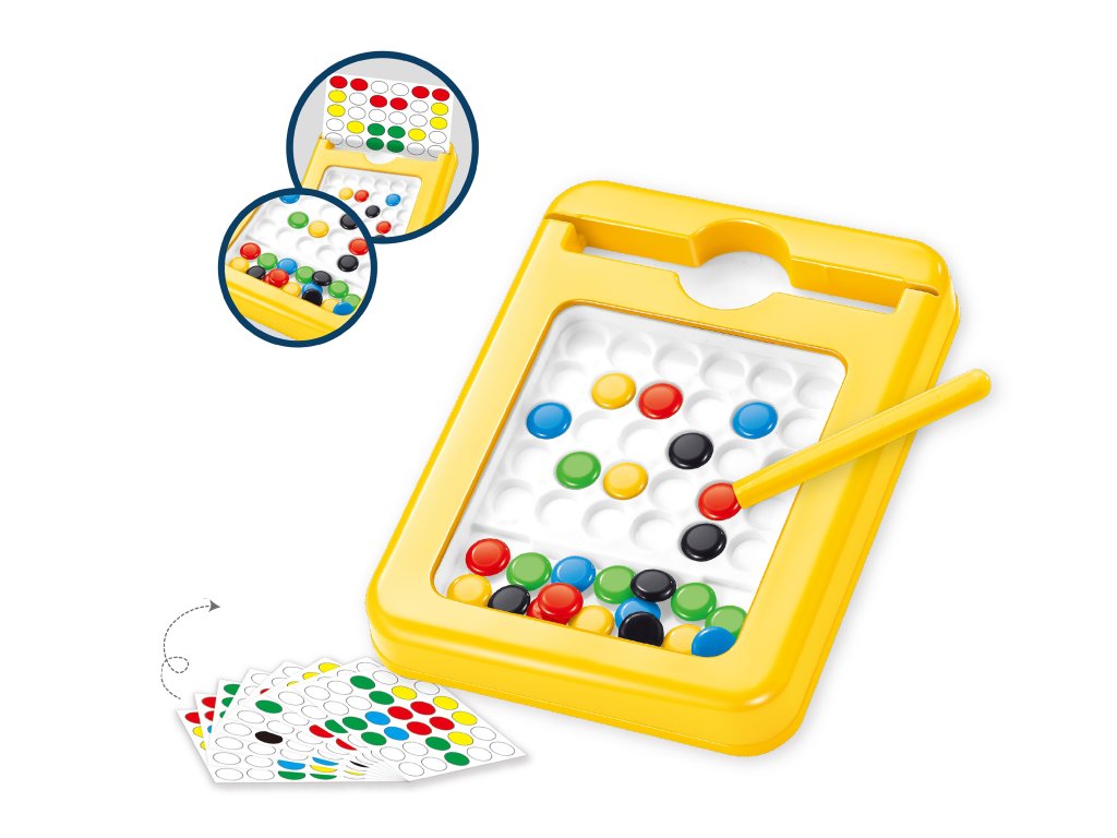 Tabulka s barevnými magnetkami. Rozměry 12,3x2,3x16,5 cm. Balení obsahuje tabulku, 30 magnetek, 8 karet se vzory.
