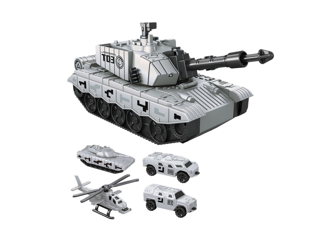 Tank na setrvačník vystřelovací. Velikost 21 cm. Vystřelování šipek - šipku zasuňte do kanónu tanku, tlačítkem na kanónu vystřelíte. Vystřelovací garáž na auta v přední části tanku - odklopte dvířka, vložte autíčko, velkým tlačítkem v zadní části tanku vystřelíte. Obsah balení - tank 21 cm, 3x vojenské auto 7 cm volná kola, vrtulník 8 cm, 8 šipek do tanku. Obrázkový návod na obalu.