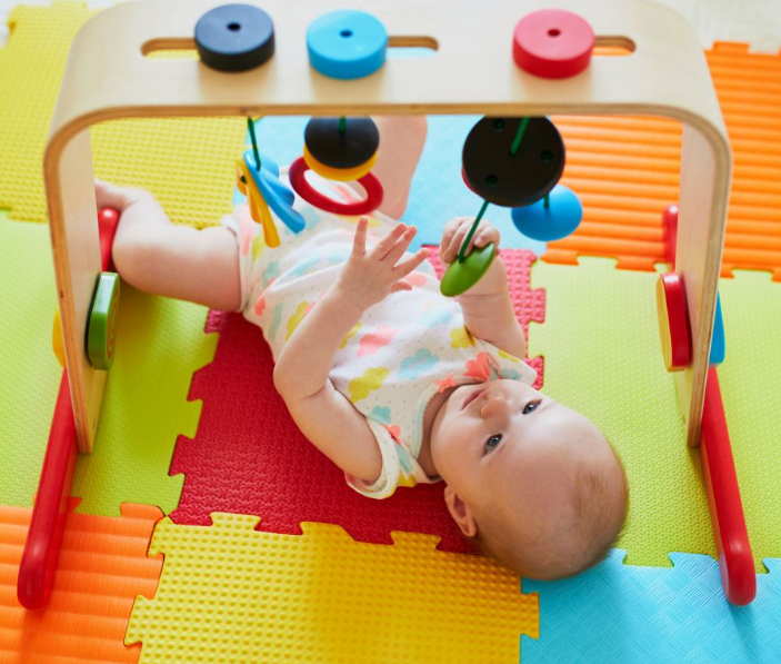Může být lákavé koupit si barevnou tělocvičnu se všemi zvonky a píšťalkami – a ano, pomáhají dětem rozvíjet koordinaci rukou a očí a mohou povzbudit „čas na bříšku“. Nicméně, přikrývka na podlaze a zrcadlo nebo nějaké zapojení rodičů mohou také udržet vaše dítě stimulované.