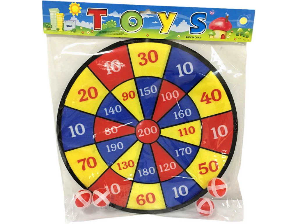 Dětský lehký barevný terč se čtyřmi softovými balonky na suchý zip, baleno v sáčku. Možnost výběru hry - šipky či míčky. Pověs si terč a začni házet, pokud trefíš střed, jsi vítěz.