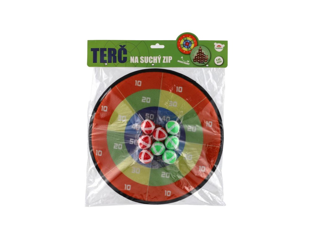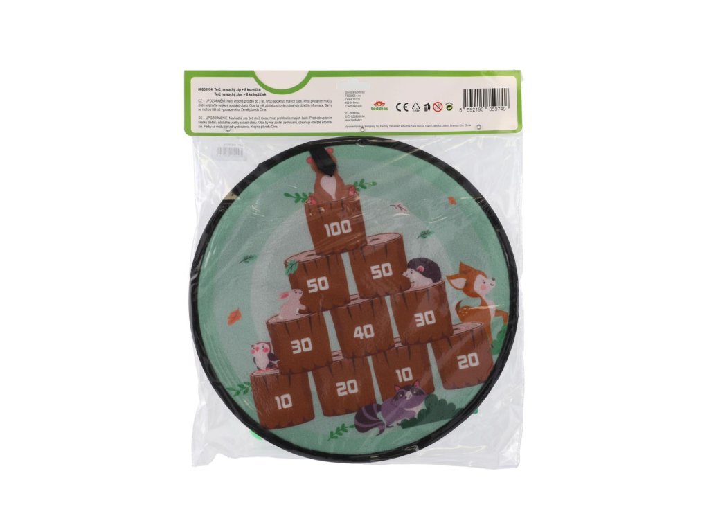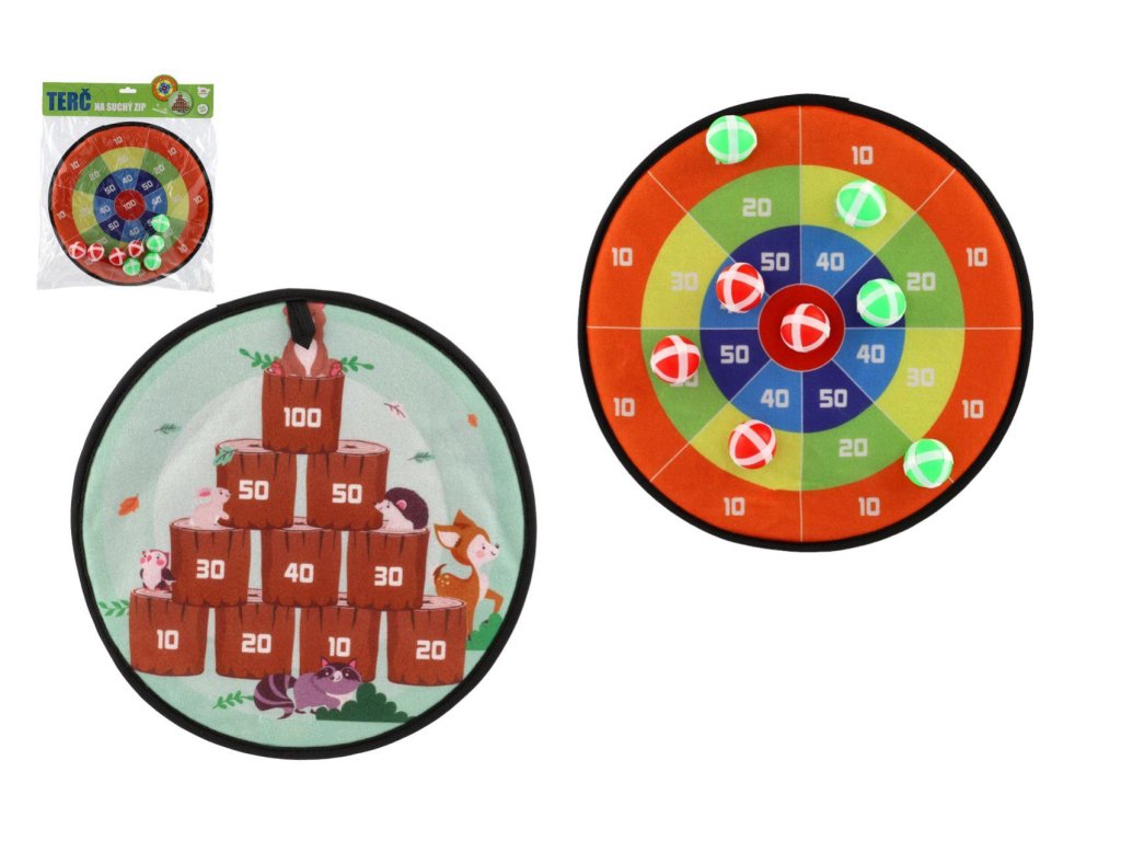 Terč na suchý zip dostane kluky i holky. Je to veselá hra, při které se vaše děti naučí mířit a házet . Nechte vaše děti soupeřit mezi sebou. Cílem hry je hodit co největší čísla. Jejich sčítáním se děti procvičí i v matematice. Terč na suchý zip má dva designy. Jedna strana terče je barevná s čísly, druhá je v motivu zvířátek v lese. Terč má očko na zavěšení. Balení obsahuje: Terč na suchý zip oboustranný + 8 ks míčků se suchým zipem.