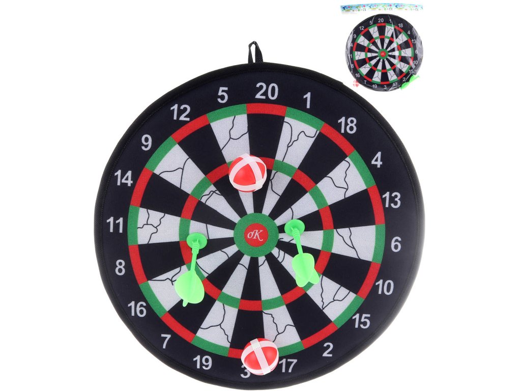 Závěsný terč na suchý zip o velikosti cca 36cm, součástí 2 lehké soft plastové míčky a 2 šipky.