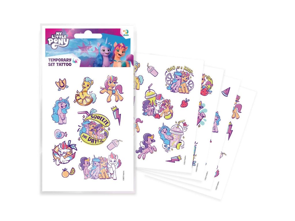 Tetování s motivem My Little Ponny. Vyber si obrázek, nalep na místo, kde ho chceš mít, jemně potři vodou, sloupni papírek a je to!