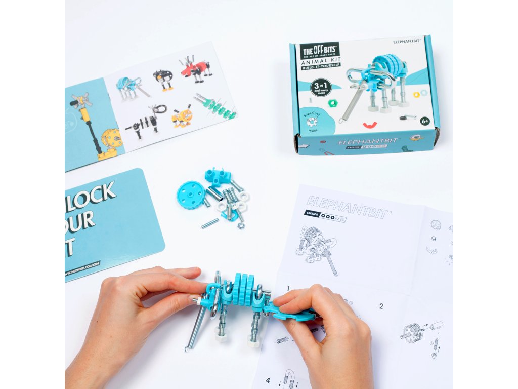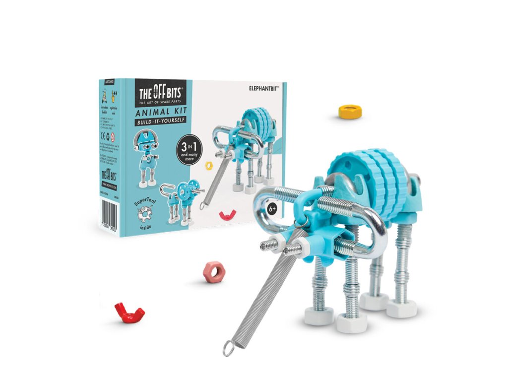 Pohybujte se divoce a svobodně! SlonBit je masivní savec, který obsahuje sortiment barevných matic, šroubů a tvarovaných kousků. Popusťte uzdu své fantazii. Tato sada umožňuje vytvoření tří modelů s dalšími nekonečnými možnostmi pro vaše vlastní kreativní nápady. Jedná se o hračku, která pomáhá mladým lidem růst v oblastech vědy, technologie, inženýrství, umění a matematiky. Hračky OffBits také podporují rozvoj jemné motoriky, prostorové představivosti, řešení problémů a nápadité hry. Co můžete postavit:SlonaBit, psaBit a robotaBit plus nekonečné množství jedinečných výtvorů, které můžete postavit pomocí své fantazie. Máte kolem sebe karton, šroubky nebo jiné zábavné materiály? Vylepšujte s předměty každodenní potřeby a vytvořte také své vlastní jedinečné vynálezy. Hlavní vlastnosti: obsahuje nářadí pro sestavení stavebnicekompatibilnost s každodenními předmětyrozvoj kreativity, jemné motoriky i logického myšlenívhodné od šesti let3 v 1návod je součástí