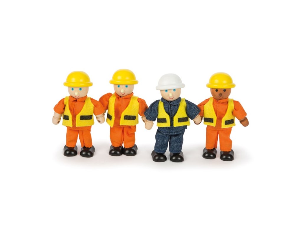 Tito čtyři stavitelé jsou všichni šťastní a připravení k práci. Tito dělníci na staveništi jsou vhodně oblečeni ve vysoce viditelných bundách a přilbách. Díky pružným pažím a nohám může každá postava stát nebo sedět. Vyrobeno z vysoce kvalitních, odpovědně získaných materiálů. Hlavní vlastnosti: každá postava může stát nebo sedět