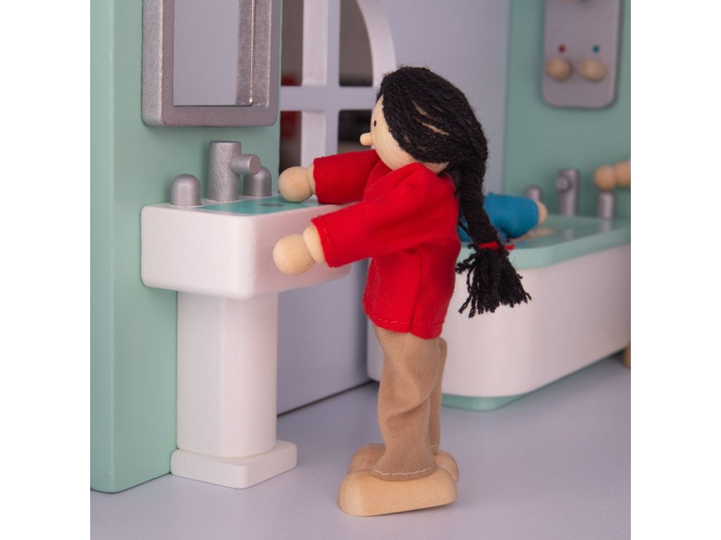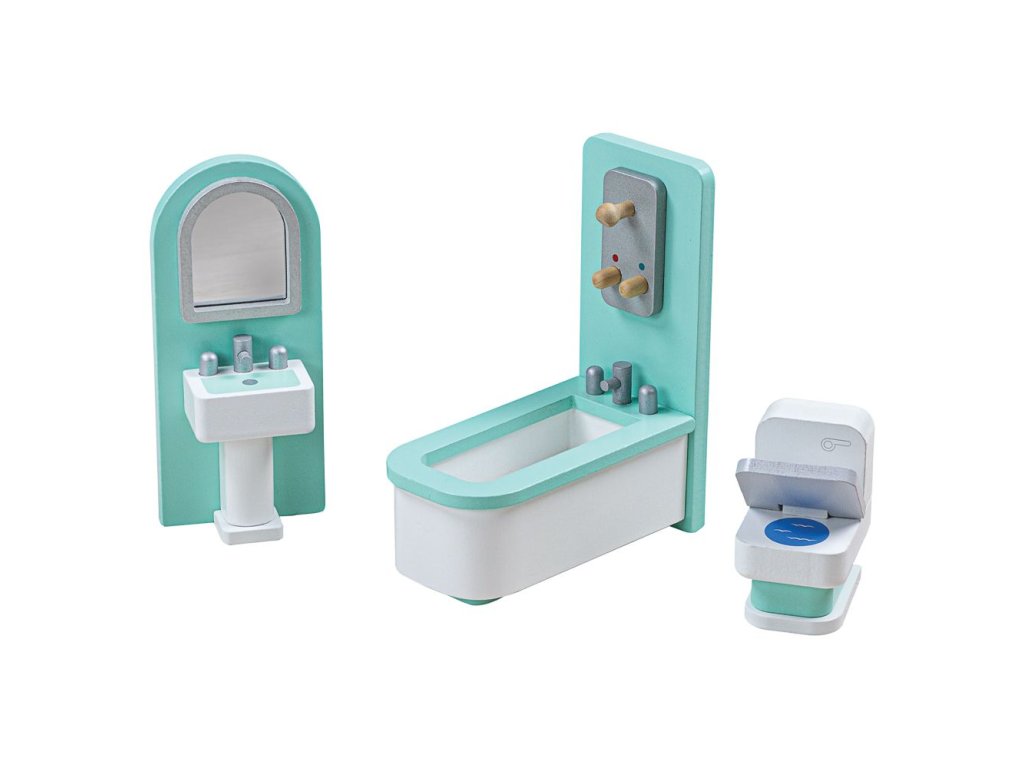 Krásný nábytek z bukového dřeva se bude hodit do každého domečku pro panenky, má prostě vše, co budou děti potřebovat k vytvoření koupelny pro panenky, které se potřebují o sebe postarat po celém dni plném her. Set o šesti kusech zahrnuje sprchový kout s textilním závěsem, vanu, umyvadlo se zrcadlem, toaletu a 2 koupelnové doplňky v podobě gumové kachničky a mycí houby. Po perném dni plném hry venku na zahradě mohou děti své panenky pořádně umýt. Krásně detailní set se bude hodit do domečku pro panenky Tidlington (T0220) a jiné domečky standardní velikosti. Podporuje kreativní a představivou hru. Vyrobeno z kvalitních materiálů z odpovědných zdrojů. Odpovídá evropské bezpečnostní normě. Skládá se z 6 dílů. Hlavní vlastnosti: set o šesti kusechsprchový kout s textilním závěsem, vana, umyvadlo se zrcadlem, toaleta, gumová kachnička a mycí houbapodporuje kreativní a představivou hru