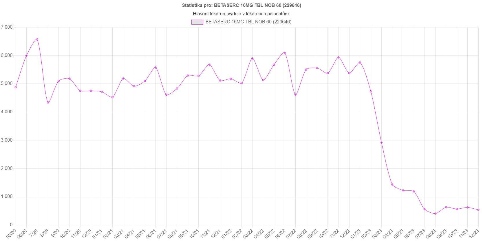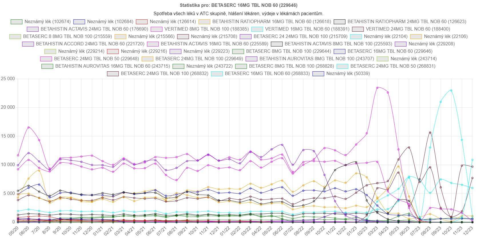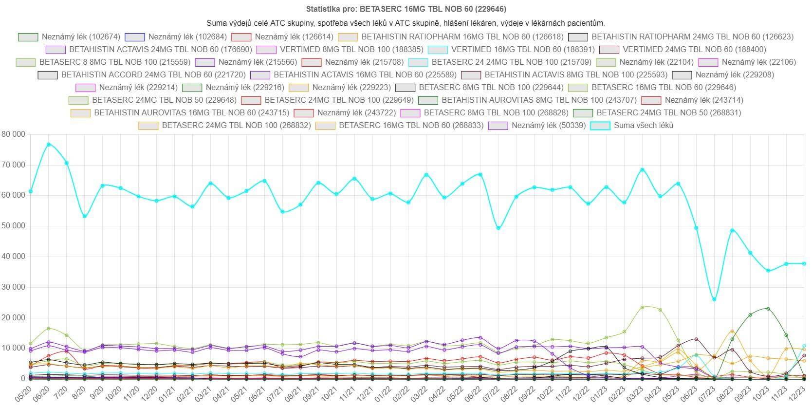 Na vytvořeném grafu se zdá, že zvolený lék, v našem případě Betaserc 16 mg po 60 tabletách, se v dubnu tohoto roku téměř přestal vydávat. Pokud ale ve formuláři zvolíme možnost zobrazit celou ATC skupinu, tedy všechny léky se stejnou účinnou látkou, zjistíme, že daný lék nahradily jiné varianty téhož.