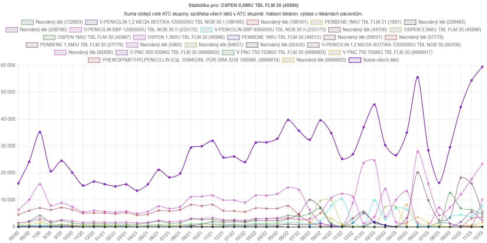 Pro přesnější představu se můžeme vrátit a zvolit “Zobrazit sumu výdejů pro celou ATC skupinu přípravku?”. Výsledkem je podobný graf, který navíc obsahuje sumu výdejů všech léků. Zde je vidět, že ačkoliv alternativy částečně vykryly poptávku po léku, celkový počet balení začal v červnu 2023 klesat.