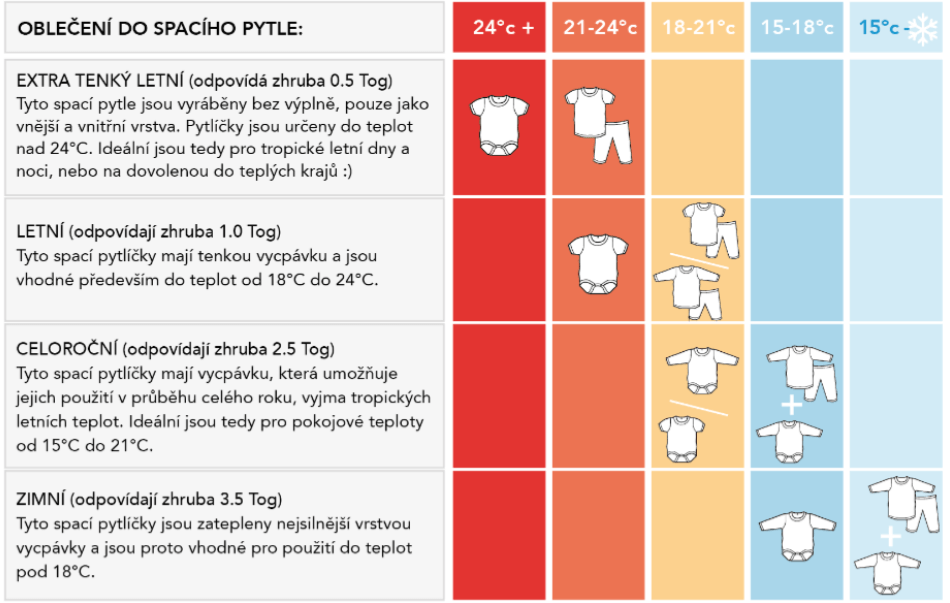 Tato tabulka pomáhá zvolit správnou velikost spacího pytle a zajistit tak optimální pohodlí pro dítě během spánku.