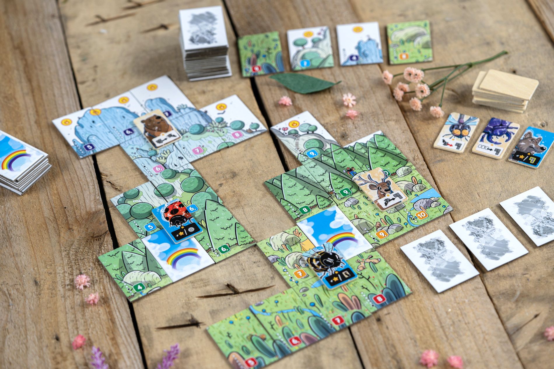 Na první pohled nás okouzlila podoba hry. Krásné ilustrace s nádechem komiksového stylu a jemná paleta příjemných barev, drobné detaily na pozadí v podobě tvorů vykukujících zpoza stromů, tulících se králíčků nebo třeba vysmátého dřevorubce prostě musí vykouzlit úsměv každému. Nás rozhodně přiměli jen tak si poskládat celou krajinu mimo hru a hledat všechny ty drobnosti. Dokážete najít i schovaného yettiho? Destičky duchů v podobě zvířat jsou navíc dřevěné, ale i ostatní destičky mají pevný materiál a působí bytelně.