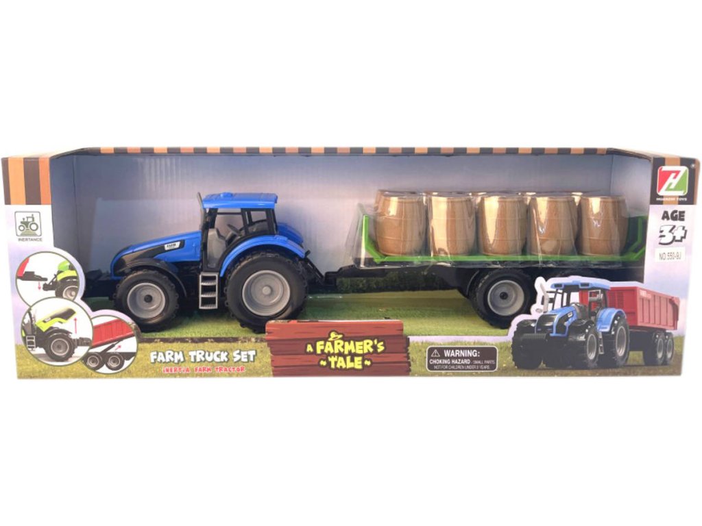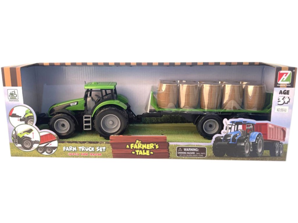 Traktor s přívěsem se senem ve 3 barvách. Velikost 45×9×7,5 cm. Pohon na setrvačník.