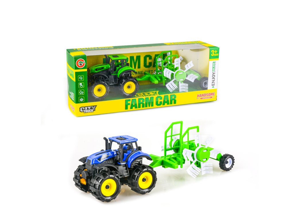 na setrvačník s přívěsem. Rozměry traktoru 25x7x7,5 cm. 2 varianty - modrá, zelená.