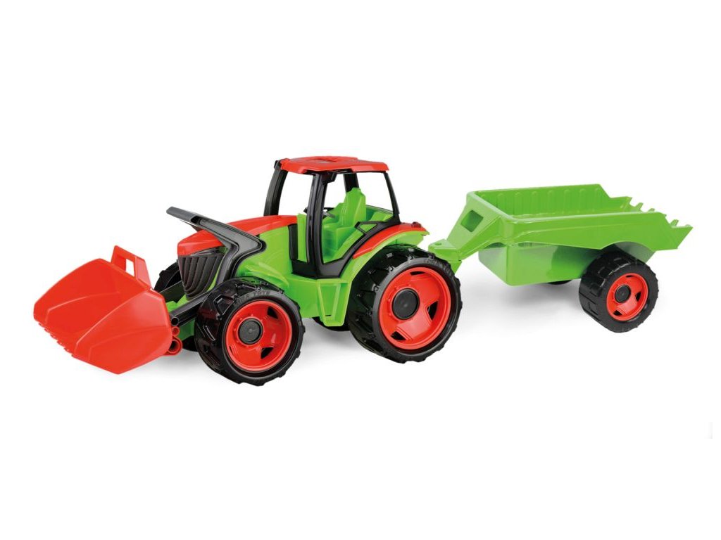 Traktor s lyžicou a s vozíkom, červeno zelený
