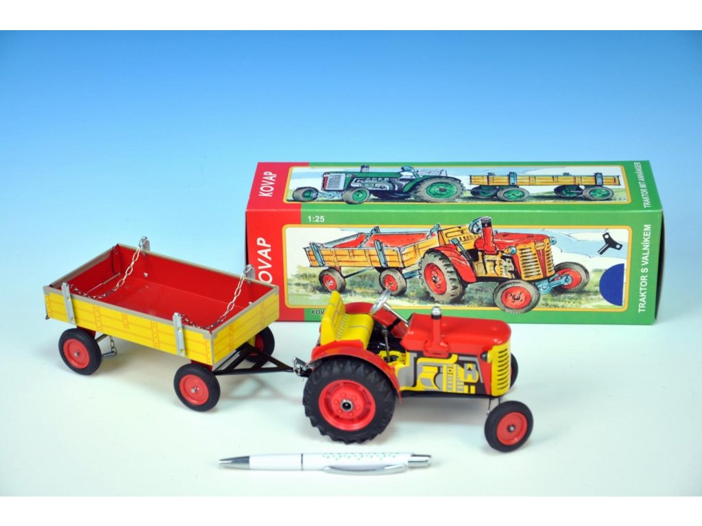 Traktor Zetor s valníkem červený od značky Kovap. Pohyb traktoru zajišťuje unikátní pérový strojek natahovaný klíčkem. Funkční převodovka má tři rychlosti dopředu a zpátečku. Traktor lze volantem skutečně řídit a navíc ho i zabrzdit ruční brzdou. Měřítko 1:25.