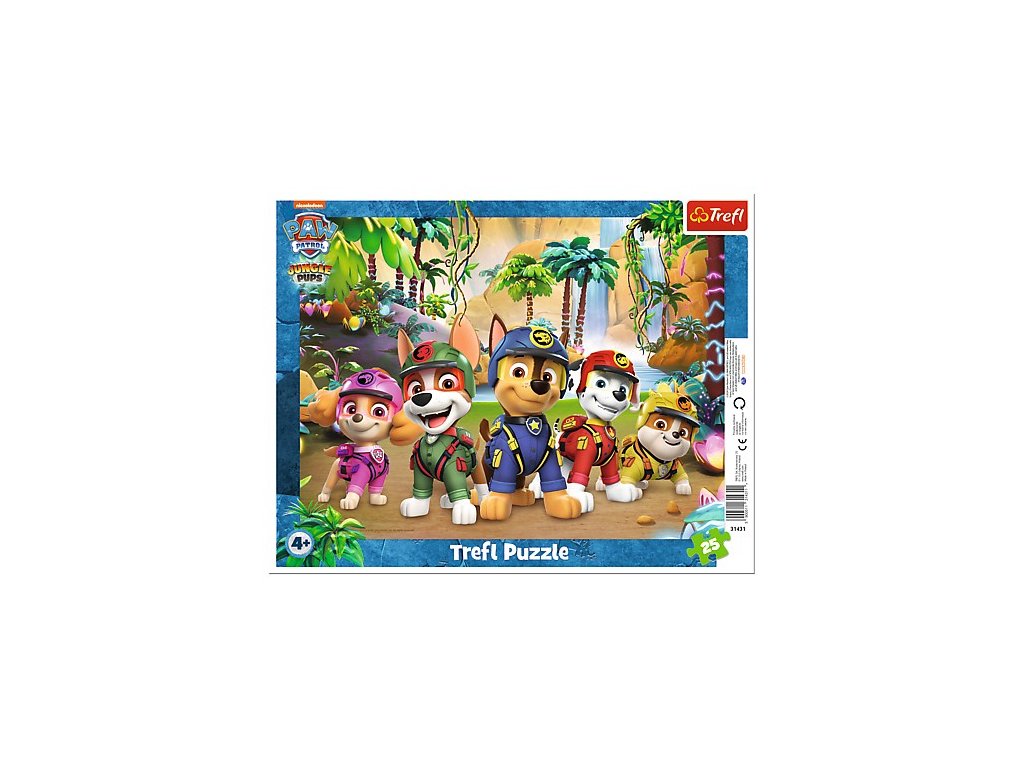 Trefl Puzzle vkládací 25 - Paw Patrol. Puzzle nemá standardní tvar dílků, jak je známe z klasického skládání. Obrázek je složen z částí nepravidelného tvaru bez zámků, jako by ho někdo rozpraskal.