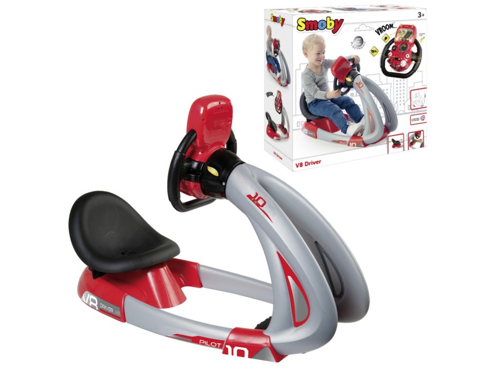Trenažér pro malé řidiče. Nastavitelné sedadlo, mechanické pedály, elektronický volant. Světelné i zvukové efekty. Rozměry: 85 x 50 x 36 cm (D x V x H). Max. nosnost 25 kg.