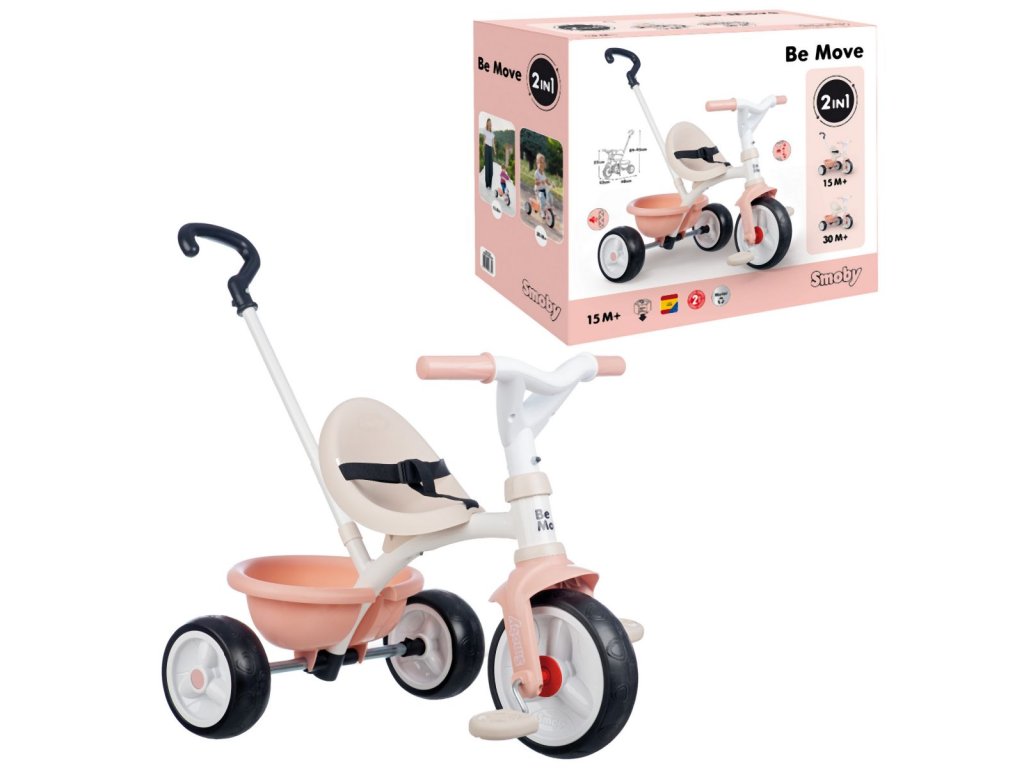 Šlapací tříkolka pro holčičky v růžové barvě má kovový rám, nastavitelnou a odnímatelnou vodící tyč (3 výškové úrovně, max. 95 cm), protiskluzové pedály s možností zablokování šlapání, nastavitelné ergonomické sedadlo na 2 pozice, bezpečnostní pás, výklopný plastový košík a tichá kolečka. Nosnost 50kg. Rozměry: 68 x 52 x 52 cm. Hmotnost: 3,479 kg.