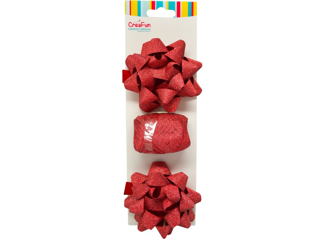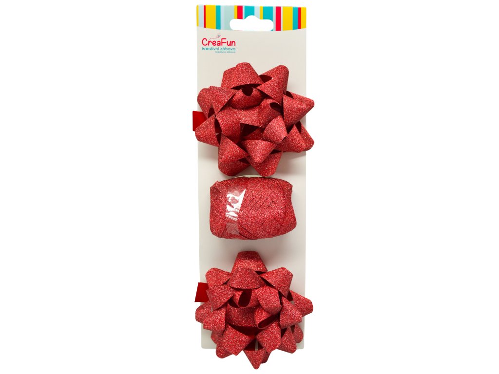 Třpytivá dárková balicí sada, červená (stuha 10 m + 2x mašle hvězda 9 cm)