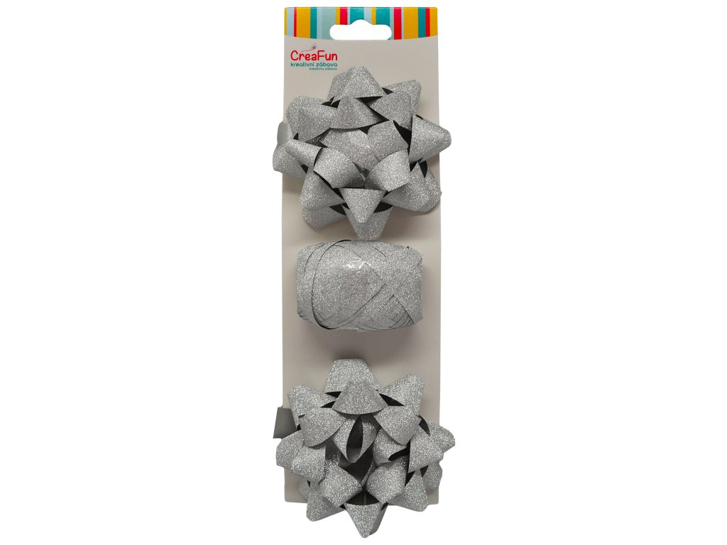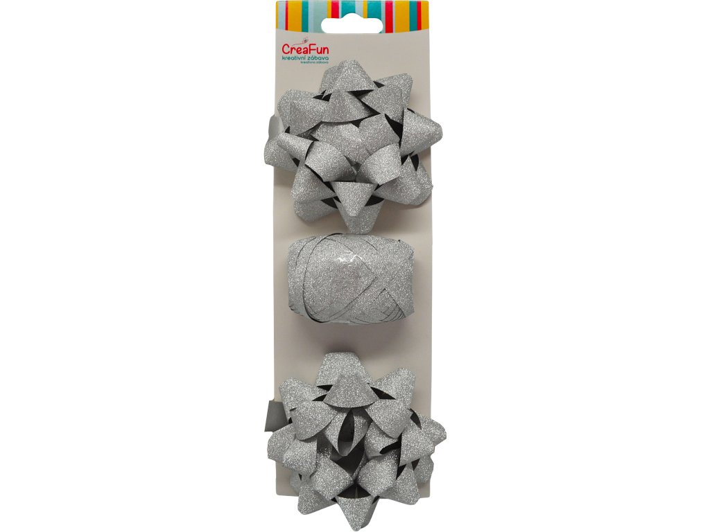 Třpytivá dárková balicí sada, stříbrná (stuha 10 m + 2x mašle hvězda 9 cm)