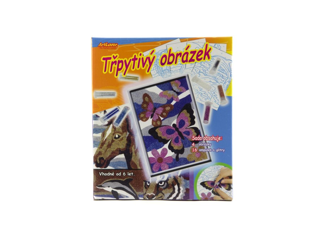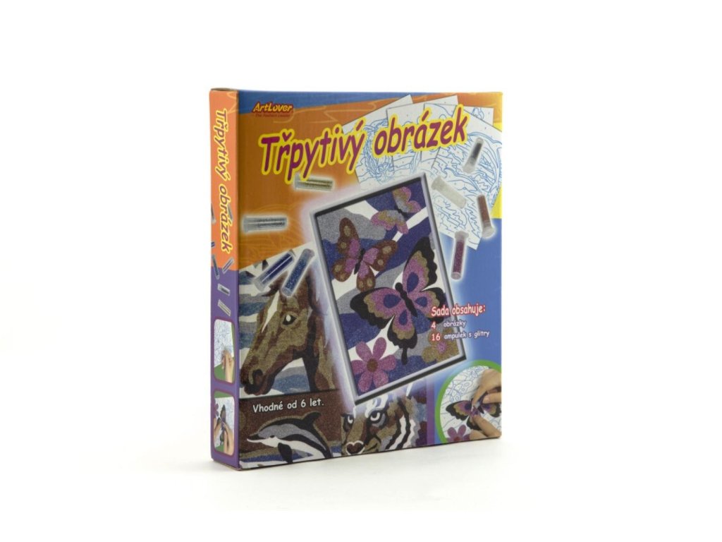 Vytvořte si třpytivý obrazek tak, že odlepíte jeden díl folie. Na vzniklou lepivou plochu nasypte třpytky. Postup opakujte na celý obrázek. Sada obsahuje 4 obrázky a 16 tubiček se třpytkami.