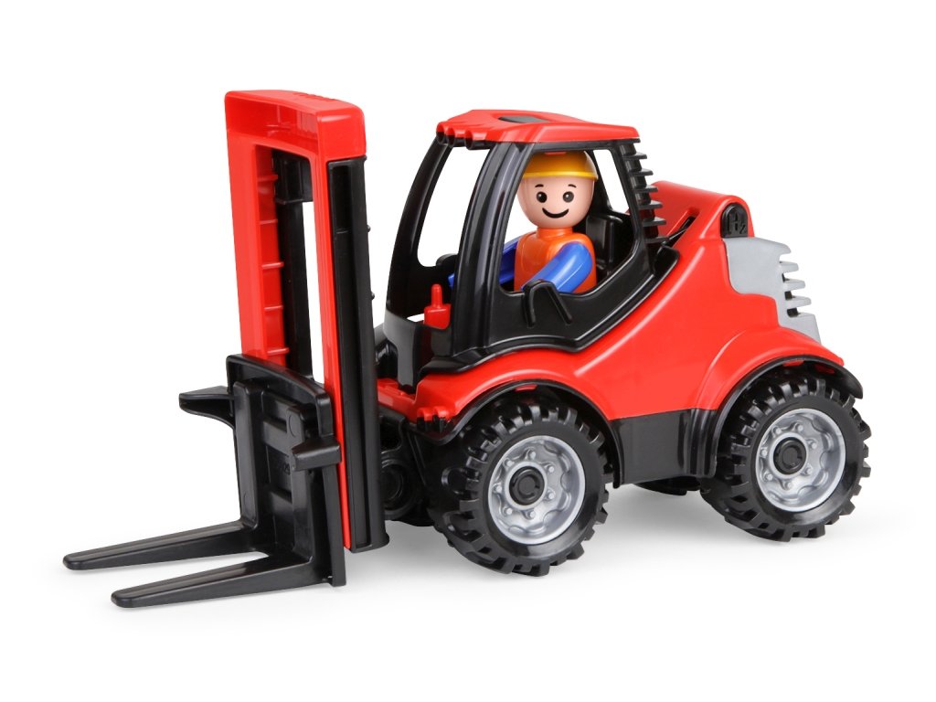 Truckies vysokozdvižný vozík z kvalitního plastu a velmi pevnou stavbou. Plně mechanicky funkční. Obsahuje odklopitelnou kabinu s aktivním panáčkem. Vyrobeno v ČR