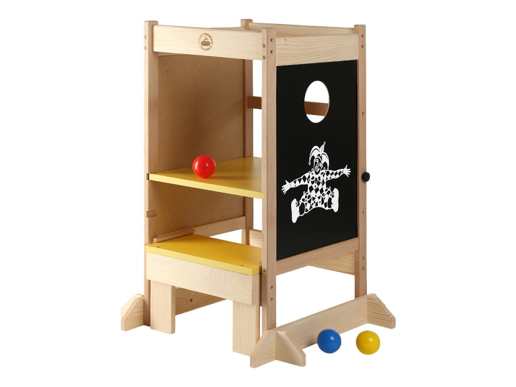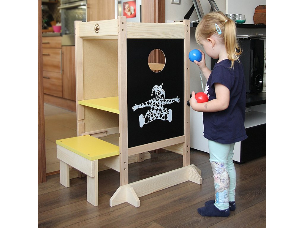 Učicí věž je víceúčelová stolička pro Vaše děti. Je vyrobená z kombinace bukového a smrkového dřeva. Umožňuje dítěti zapojit se do různých tvořivých činností u kuchyňské linky či pracovního stolu. Práce na kuchyňské lince zdokonaluje dítěti motorické schopnosti, a máte dítě neustále pod kontrolou. Věž dětem umožní být v úrovni pracovní desky, vidět vše, co děláte a tvořit s Vámi. Učicí věž se skládá ze stojací plochy, na které dítě stojí, schůdku, po kterém se na ni dostane a z ohrádky okolo. Při používání nenechávejte učicí věž v prostoru, ale vždy věž umístněte stranou naproti schůdku k pevné překážce (kuchyňská linka apod.). Víceúčelová stolička se používá jako: stojací věž-dvě výškové polohy stoleček se židličkou kreslící tabule na křídyzábavná tabule s klaunem s možností prohazování míčků Upozornění:Prodejem učící věže nepřebíráme odpovědnost za bezpečnost dítěte. Dítě na učící věži musí být pod stálým dozorem dospělé osoby! Hlavní vlastnosti: zdokonaluje motorické schopnostiodolná konstrukce, multifunkčnívyrobeno v české republice