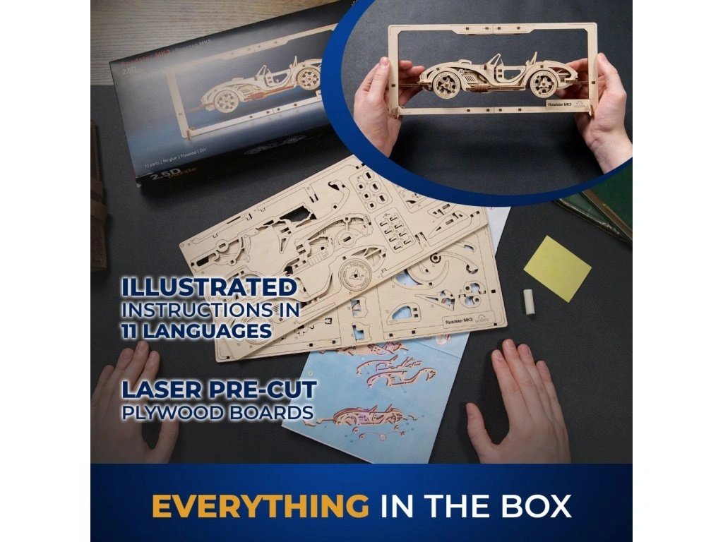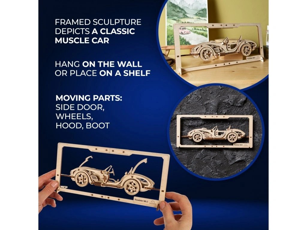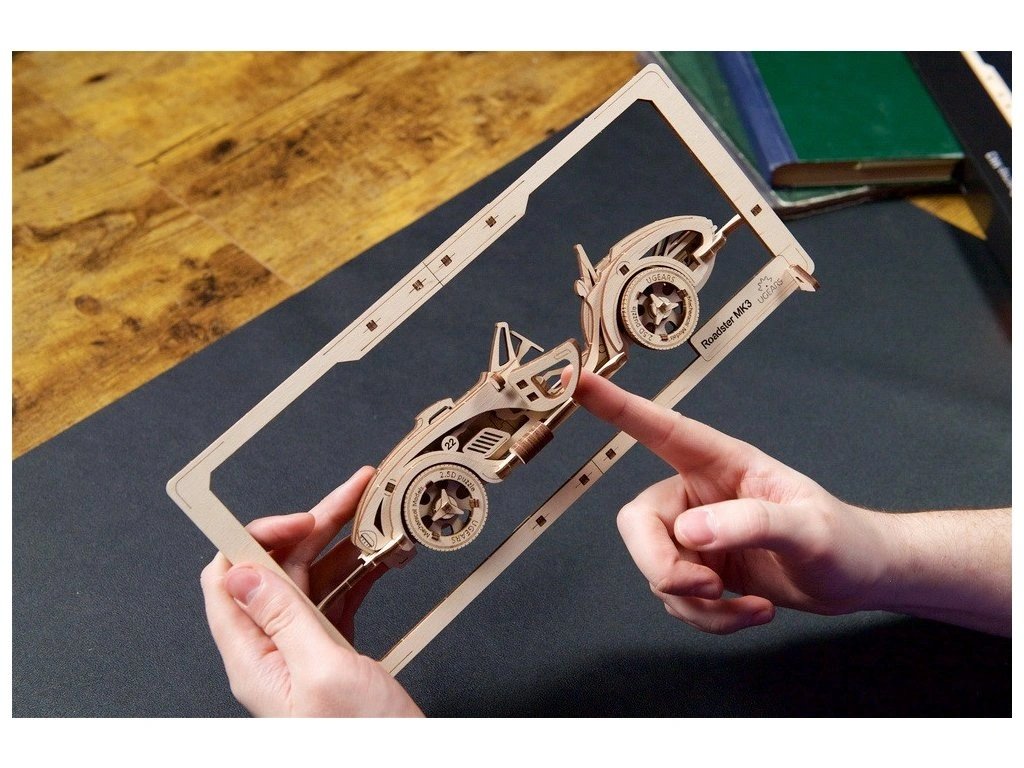 Roadster MK3 z nové kolekce Classic Vehicles patří do první série nové řady 2,5D dřevěných mechanických stavebnic. Tento automobil, stejně jako ostatní klasická vozidla z nové řady, se liší od všeho, co UGEARS vyráběl dříve. Tyto dřevěné obrázky jsou sice určeny pro statické vystavení, ale mají pohyblivé části. Roadster MK3 je vsazen do vlastního rámečku, je tedy vhodný k pověšení na zeď, a je dodáván se stojánkem, který umožní vystavit si své dílo na stole nebo na poličce. Je detailně propracovaný, má otevírací dveře, kapotu a zavazadlový prostor, otočná kola a dokonce pohyblivou řadící páku. K sestavení modelu není zapotřebí žádné nářadí ani lepidlo. Stačí vytlačit přesné, laserem vyřezané dílky z dřevěných desek, zacvaknout je k sobě a model je hotov. Tato stavebnice je vhodná i pro začátečníky, sestavení trvá cca 30 minut a součástí balení je obrázkový návod. Roadster MK3 je vyroben ze dřeva umělecké kvality a je možné jej ponechat v atraktivním přírodním vzhledu, nebo jej natřít či namořit dle Vašeho přání (barvy nejsou součástí balení). Tento model je inspirován silnými automobily minulého století, zvláště pak britsko-americkým sportovním roadsterem Shelby Cobra, který se vyráběl v období 1962 – 1967 v Los Angeles ve Spojených státech a Thames Ditton ve Velké Británii. Hlavní vlastnosti: rozvíjí jemnou motoriku, trpělivost a prostorovou představivostkvalitní materiál a zpracování62 laserem vyřezaných dílkůdoba sestavení cca 30 minutjednoduchá obtížnostobrázkový návod je součástí balenívhodné jako dáreknavrženo a vyrobeno na Ukrajině