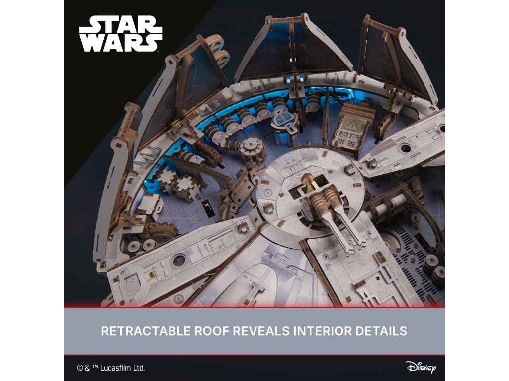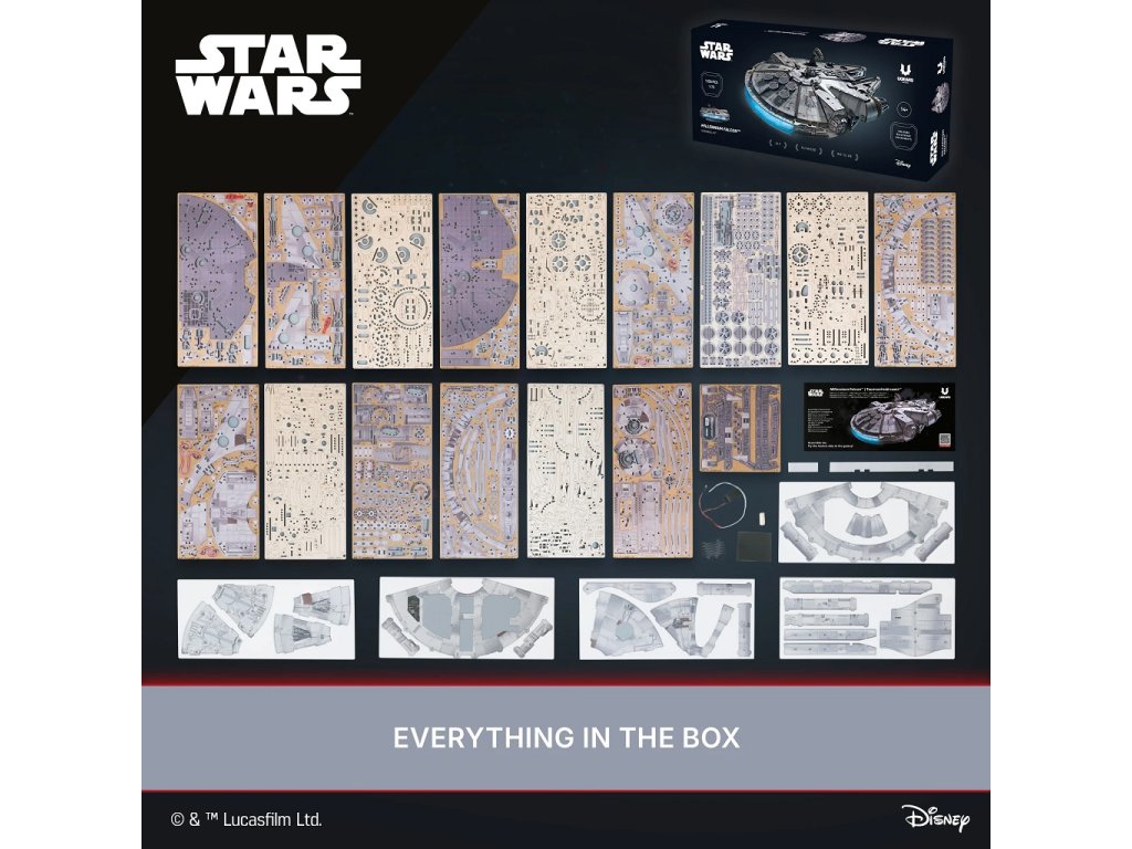 Postavte si legendární loď Millennium Falcon, ve které létal Han Solo a jeho posádka. Má modrá LED světla jako hyperpohon, otevírací střechu, nákladový prostor a rampu, pohyblivé dělostřelecké věže a anténu otočnou o 360°. Nechybí ani propracované detaily interiéru a exteriéru.Poskládejte a pilotujte nejrychlejší loď v galaxii! Proleťte Kessel Run za méně než dvanáct parseků s touto skládačkou z Ugears oficiální kolekce Star Wars.Model milované lodi Hana Sola a Chewbaccy v měřítku 1 : 75 je jedním z nejdetailnějších modelů. Millennium Falcon, klíčová stíhačka v nejzásadnějších bitvách proti Galaktickému impériu, prošla rukama řady zločinců, než byla nakonec ukradena a pilotována Rey ve filmu Síla se probouzí (2015), než ji Han a Chewie získali po tolika letech konečně zpět do svých rukou.Má detailní barevné prvky v interiéru i exteriéru, vypadá jako opravdová loď, kterou znají všichni fanoušci z filmů Star Wars. Hyperpohon simulují modrá LED světla, které jsou napájená bateriemi, ty však nejsou součástí balení.Mezi pohyblivé prvky patří dveře nákladového prostoru, rampa, podvozek, dělostřelecké věže, anténa otočná o 360° a zatahovací střecha, která se otevírá na části a umožňuje zobrazit opravdu detailní a realistický interiér lodi. Dřevovláknitá deska s vysokou hustotou a karton dodávají lodi větší odolnost a zajímavý vzhled. Postavte si kus filmové historie, postavte si impozantní 3D model lodi Millennium Falcon. Hlavní vlastnosti: Star Wars model s modrými LED světly jako hyperpohontlačítko zapíná/vypíná LED světla napájená bateriemi (nejsou součástí balení)otevírací střechaotevírací nákladový prostor s pohyblivou rampoupohyblivé dělostřelecké věžeanténa otočná o 360°detailní zpracování interiéru a exteriérubarevné dílky dodávají realistický nádechdřevovláknitá deska s vysokou hustotou pro větší odolnoststojan na vystavenímontáž bez lepidla a nástrojůobsahuje 1235 dílkůvysoká obtížnost