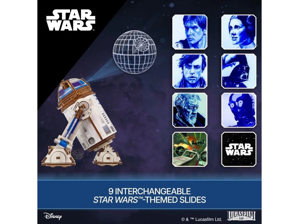 Postavte si svého vlastního věrného rebelského droida R2-D2. Dřevěný model má pohyblivé nohy, díky natahovacímu motoru se hýbe a má i opravdový LED projektor!Je malý, ale šikovný! Dřevěný model z barevné překližky má mnoho detailů a věrně zachycuje design tohoto oblíbeného droida. R2-D2 sloužil legendárním hrdinům jako je Anakin Skywalker, Padmé Amidala, Luke Skywalker… nyní je připraven sloužit vám. Je vybaven pohyblivými nohami, které lze nastavit do dvou pozic, a funkčním LED projektorem, přes který odhalí obrázky postav ze Star Wars. Kouzlo galaxie může přinést i do vaší poličky.Pohybuje se díky natahovacímu mechanismu. Stačí otočit disk skrytý pod hlavou droida, položit jej na místo a zatáhnout za páčku „start/stop“. Teď už se jen dívejte, jak jede kupředu, stejně jako ve filmech! Mini projektor napájený bateriemi se zapíná na hlavě droida, poznáte všechny barevné scény Star Wars? Diapozitivy z překližky a kartonu jsou uloženy ve zvláštní přihrádce v těle droida, lze je měnit pomocí přiloženého nástroje. Ať už stojí, nebo se řítí do akce, vychytralý R2-D2 je vždy připraven na cokoliv. Hlavní vlastnosti: Star Wars model s natahovacím motoremtlačítko „start/stop“ droida rozpohybujedokáže ujet až 200 cm2 pózy – stojí rovně, nebo nakloněný dozaduLED projektor napájený bateriemi (nejsou součásti balení)9 vyměnitelných modrobílých diapozitivůdetailní zpracovánímontáž bez lepidla a nástrojůobsahuje 315 dílkůstřední obtížnost