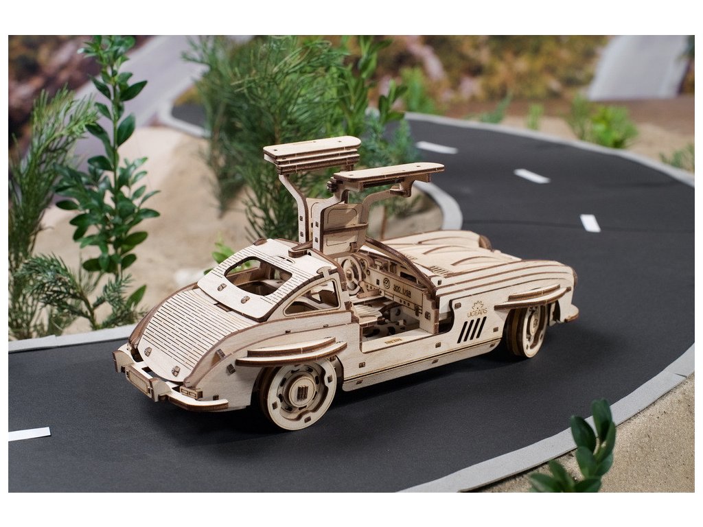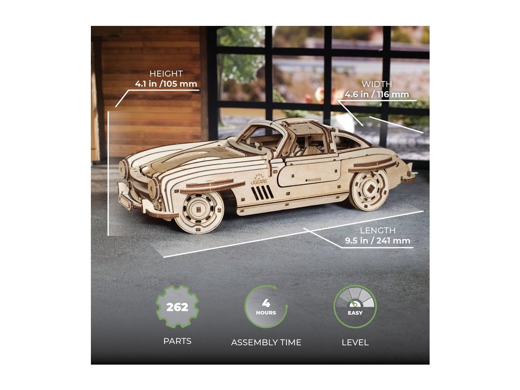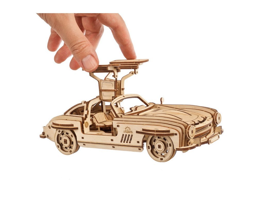 Pojďme mluvit o autech! Auta jsou cool a jedno z nejúžasnějších z nich může být sportovní Coupe: elegantní a stylové dvoudveřové auto navržené pro vysoký výkon a požitek z jízdy. Sportovní Coupe, která jsou často postavena s nízkým a širokým profilem, se obvykle vyznačují výkonným motorem, sportovně vyladěným odpružením, aerodynamickým designem a dalšími prvky zvyšujícími výkon, které upřednostňují rychlost, obratnost a ovladatelnost. Každý, kdo viděl „Návrat do budoucnosti“, si jistě pamatuje tento ikonický typ vozu, jenž ve filmu sloužil jako stroj času Martyho McFlyho. Neobvyklé dveře, navržené podle křídel racka, jsou podívanou a automobilovou ladností. Jsou sklopná a otevírají se nahoru, čímž vytvářejí větší prostor pro snadné nastupování a vystupování než tradiční dveře. Toto auto má 2 provozní režimy: naviňte jej pomocí ráčnového klíče umístěného pod odnímatelným podvozkem, nebo zatáhněte vůz zpět po rovném povrchu a uvolněte. Vůz má také kapotu, která se zvedne a odhalí model motoru. Autíčko je vyrobeno z kompozitních dřevěných dílů vysoké kvality, které vyloupnete z předem nařezaných desek. Stejně jako u všech modelů doporučujeme obrousit veškeré otřepy na dřevěných dílkách a dále navoskovat ozubená kola či jiné pohyblivé části, dokud vše nepoběží hladce. Sada má 262 dílů a patří do střední úrovně obtížnosti. Vše, co potřebujete k sestavení, je přímo v krabici, včetně brusného papíru, vosku a podrobných pokynů v 11 jazycích (angličtina, ukrajinština, němčina, španělština, francouzština, italština, portugalština, polština, japonština, čínština a korejština ). Hlavní vlastnosti: 262 precizně vyřezaných dílkůstřední obtížnost sestavenívýsledný model je řiditelný a schopný samostatné jízdynavrženo a vyrobeno na Ukrajině