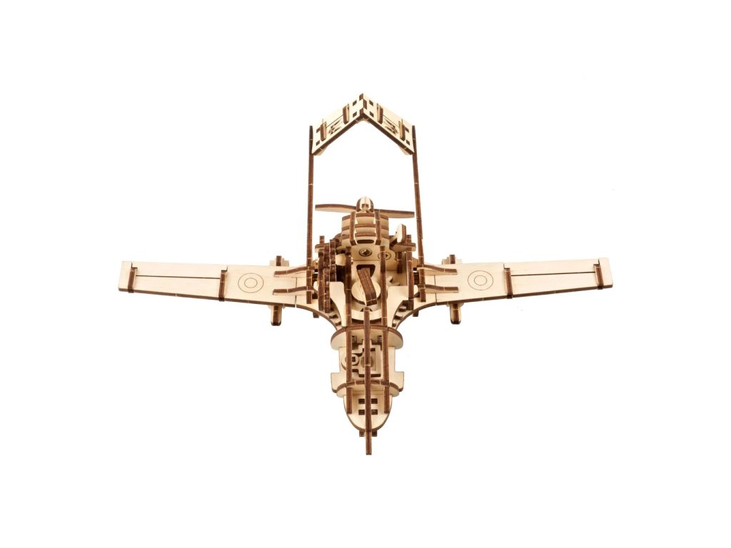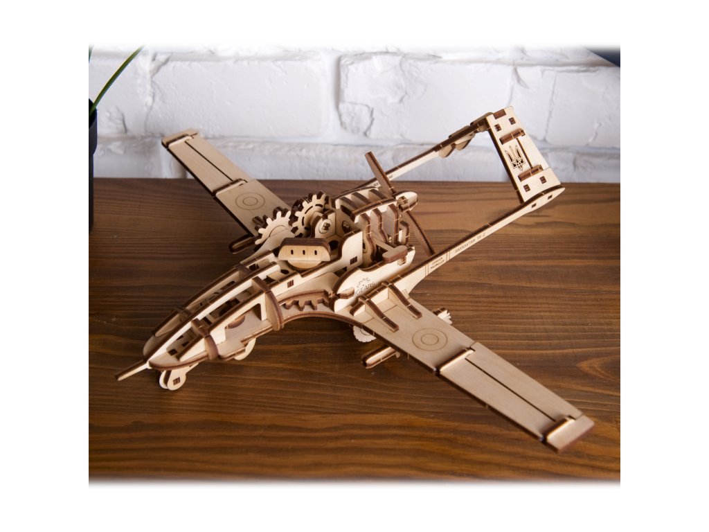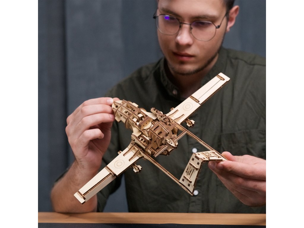 Ve jménu hrdosti a úspěchu! Stavebnice bezpilotního letounu vyrobená z překližky. Jedinečný stroj se zapsal do srdcí a myslí vojáků i běžných lidí díky řadě úspěchů, kterých bylo s jeho pomocí dosaženo při obraně celistvosti území Ukrajiny. Původem turecký Bayraktar (česky Vlajkonoš) patří mezi méně nákladné, přitom ovšem spolehlivé a vysoce univerzální bitevní prostředky. Díky své velikosti a manévrovacím schopnostem se osvědčil zejména v boji s konvenčními systémy protivzdušné obrany. Stavbou a vystavením jeho modelu si můžete připomenout všechna malá vítězství i důležité projevy mezinárodní solidarity, které jsou s tímto unikátním dronem nově spojeny. Pomyslným srdcem natahovacího pohonu letadla je odolná a spolehlivá kovová pružina. Po několikerém otočení zabudovaným klíčem je stroj připraven ke spuštění pomocí malé postranní páčky. Je-li model umístěn na rovném povrchu, po odstartování pozvolna popojíždí. Zároveň s tím se otáčí jeho tlačná vrtule, která při pohybu vydává autentický bzučivý zvuk. Díky promyšlenému návrhu nebudete ochuzeni o poutavý pohled na pohybující se soukolí pohonu. Atraktivitu miniatury pak zvyšuje i řada drobných detailů, pohyblivá sledovací kamera umístěná pod trupem, funkční vztlakové i směrové klapky a odnímatelné rakety zavěšené pod křídly. Vybaveno detailním návodem k sestavení. Hlavní vlastnosti:125 precizně vyřezaných dílkůstřední obtížnost sestavenídrobné mechanické a volně uložené detailyvýsledný model je schopný samostatné jízdynavrženo a vyrobeno na Ukrajině