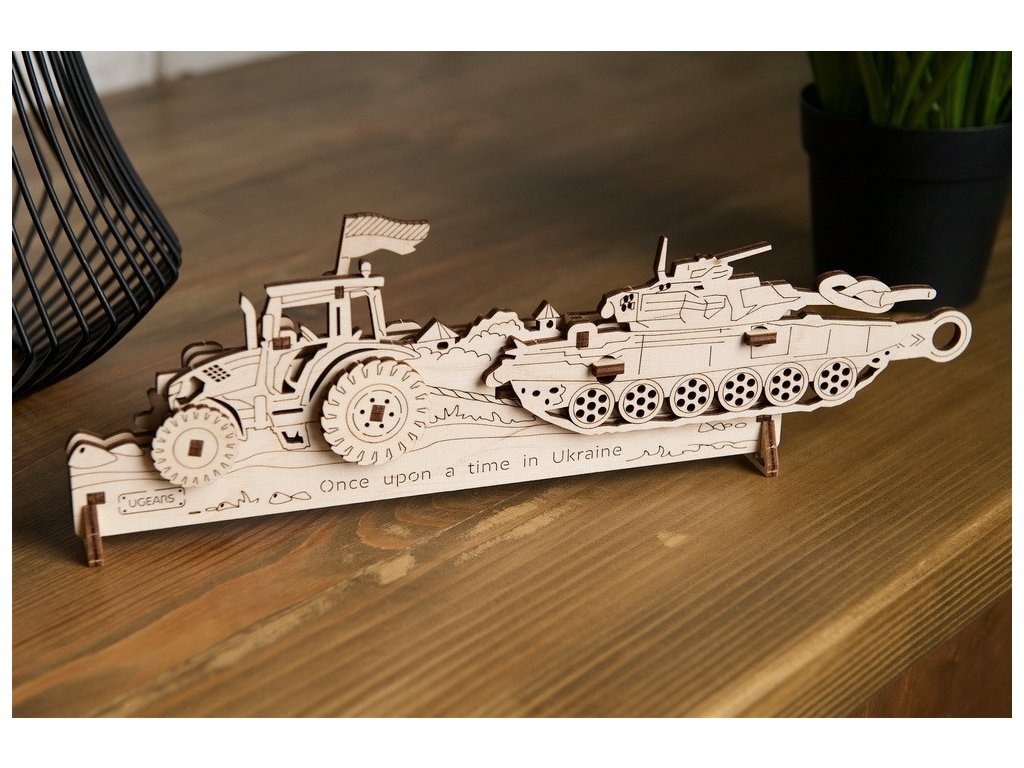 Mechanický model Brave Tractor se skládá z ukrajinského traktoru s ukrajinskou vlajkou jednoho z ukrajinských farmářů, který táhne ruský tank poškozený bojovými akcemi. Model využívá zajímavý a zároveň velmi jednoduchý mechanismus: pohněte rukojetí - a kola traktoru se budou pohybovat proti směru hodinových ručiček a vytvoří charakteristické praskání. Tank simuluje houpání, protože ho tahač táhne po polní cestě.V sadě Brave Tractor (jako v každé sadě ze série Age of the Brave) najdete příjemný bonus – neposedu Trident. Jedná se o miniaturní model Ugears, originální suvenýr s prvkem mechaniky, který má "očko" na zavěšení a může se stát stylovým přívěskem na klíče. Trojzubec je státním znakem Ukrajiny, symbolem její síly, svobody a nezdolnosti.Dřevěný model Brave UA Tractor má 51 dílů a zvládne ho sestavit za pouhých 30 minut i začátečník v modelování. I když jste se nikdy nezabývali 3D skádankami, zjistíte, že se v nich budete orientovat celkem snadno díky ilustrovaným instrukcím krok za krokem v 11 jazycích (angličtina, ukrajinština, němčina, španělština, francouzština, italština, portugalština, polština, japonština, čínština a korejština). A - tady je to potěšení - kromě návodu nebudete potřebovat nic dalšího, protože konstruktéři Ugears nepotřebují lepidlo ani žádné další nástroje. Všechny díly jsou vyřezány laserem do překližky - stačí je sejmout z desky a spojit dohromady! Hlavní vlastnosti: 51 precizně vyřezaných dílkůnízká obtížnost sestavenídrobné mechanické detailynavrženo a vyrobeno na Ukrajině