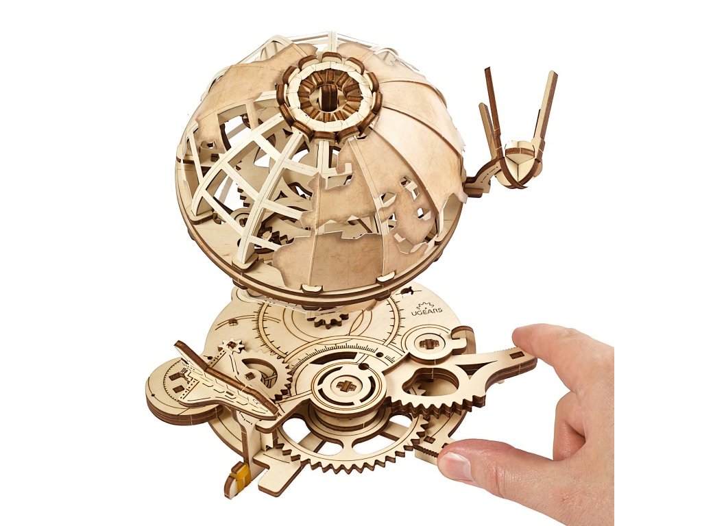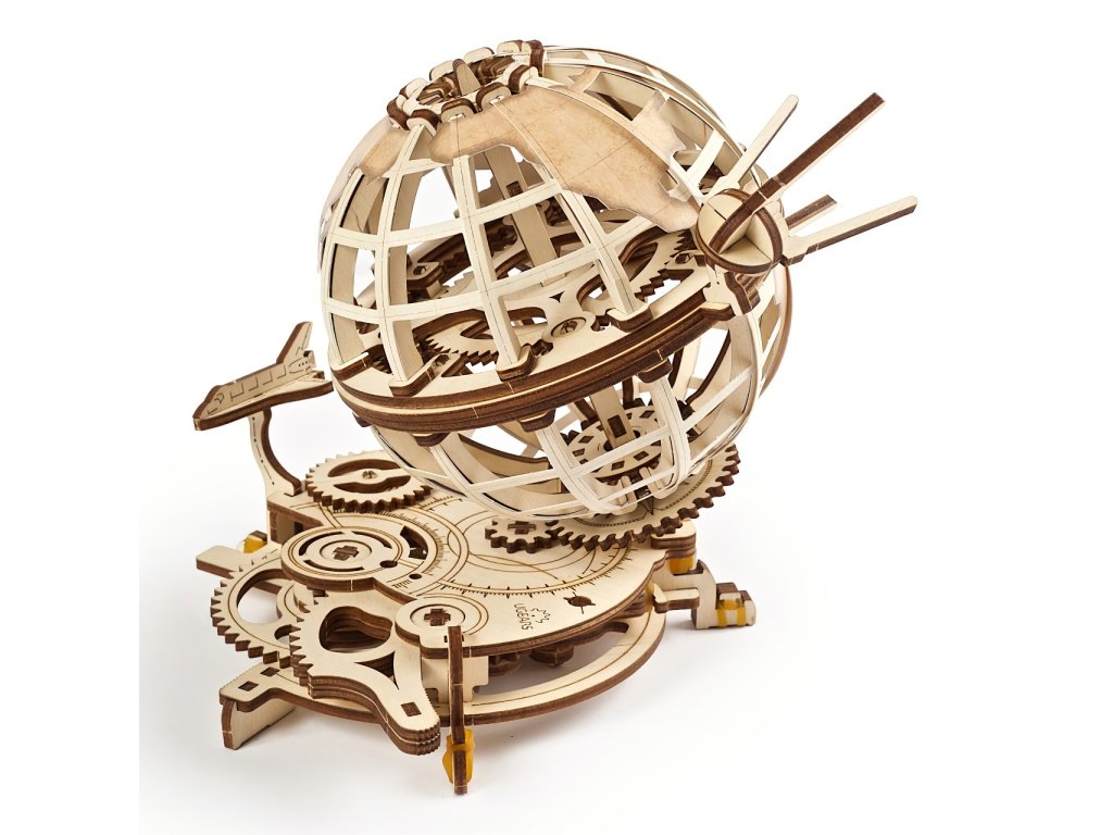 A přece se točí! Stavebnice glóbusu vyrobená z překližky. Výsledný model vzbudí nadšení u fanoušků kosmonautiky i mechaniky a stane se ozdobou Vaší poličky. Je poháněn pákovým natahovacím mechanismem, jehož spuštěním uvedete do chodu jak glóbus, tak poutavé planetové soukolí pohánějící jeho orbitu. Na jedno natažení opíše orbit dvě otáčky a glóbus, díky jednoduchému kyvadlu, přesně polovinu. Směr otáčení si můžete zvolit. Stavebnice nabízí variabilitu provedení, dekorační kontinenty jsou přiloženy ve dvou úpravách. Také si můžete vybrat, zda model Země necháte obíhat model raketoplánu, nebo první umělé družice, Sputniku. Nepoužitý satelit můžete připnout k podstavě modelu jako doplňkovou kulisu. Vybaveno detailním návodem k sestavení. Hlavní vlastnosti:184 precizně vyřezaných dílkůnízká obtížnost sestavenínavrženo a vyrobeno na Ukrajině