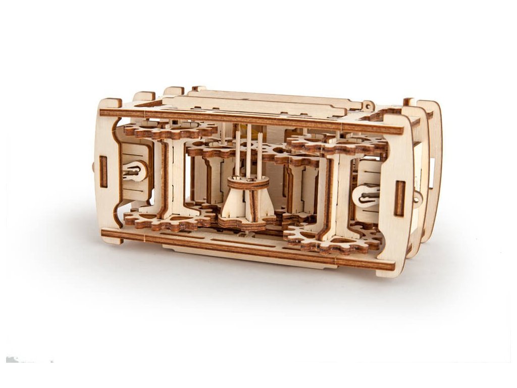 Vzhůru dolů. Stavebnice kabinové lanovky včetně tratě vyrobená z překližky. Kabina za dvířky střešního únikového okna ukrývá drobný úložný prostor. Mechanika je do detailu propracovaná a kabina je zbavena pláště, vy tak můžete pozorovat chod soukolí uvnitř. Kabina se dokáže pohybovat spádem, sklon lze nastavovat pomocí dvojice pák na koncích tratě. Díky natahovacímu mechanismu je ovšem model schopen i jízdy do kopce. Pro tyto účely je vybaven spouštěmi umožňujícími dopředný i zpětný chod. Vybaveno detailním návodem k sestavení. Hlavní vlastnosti: 154 precizně vyřezaných dílkůstřední obtížnost sestaveníúložný prostornastavitelný sklon tratěvýsledný model je schopný pohybu spádem i samostatné jízdy včetně zpátečkynavrženo a vyrobeno na Ukrajině